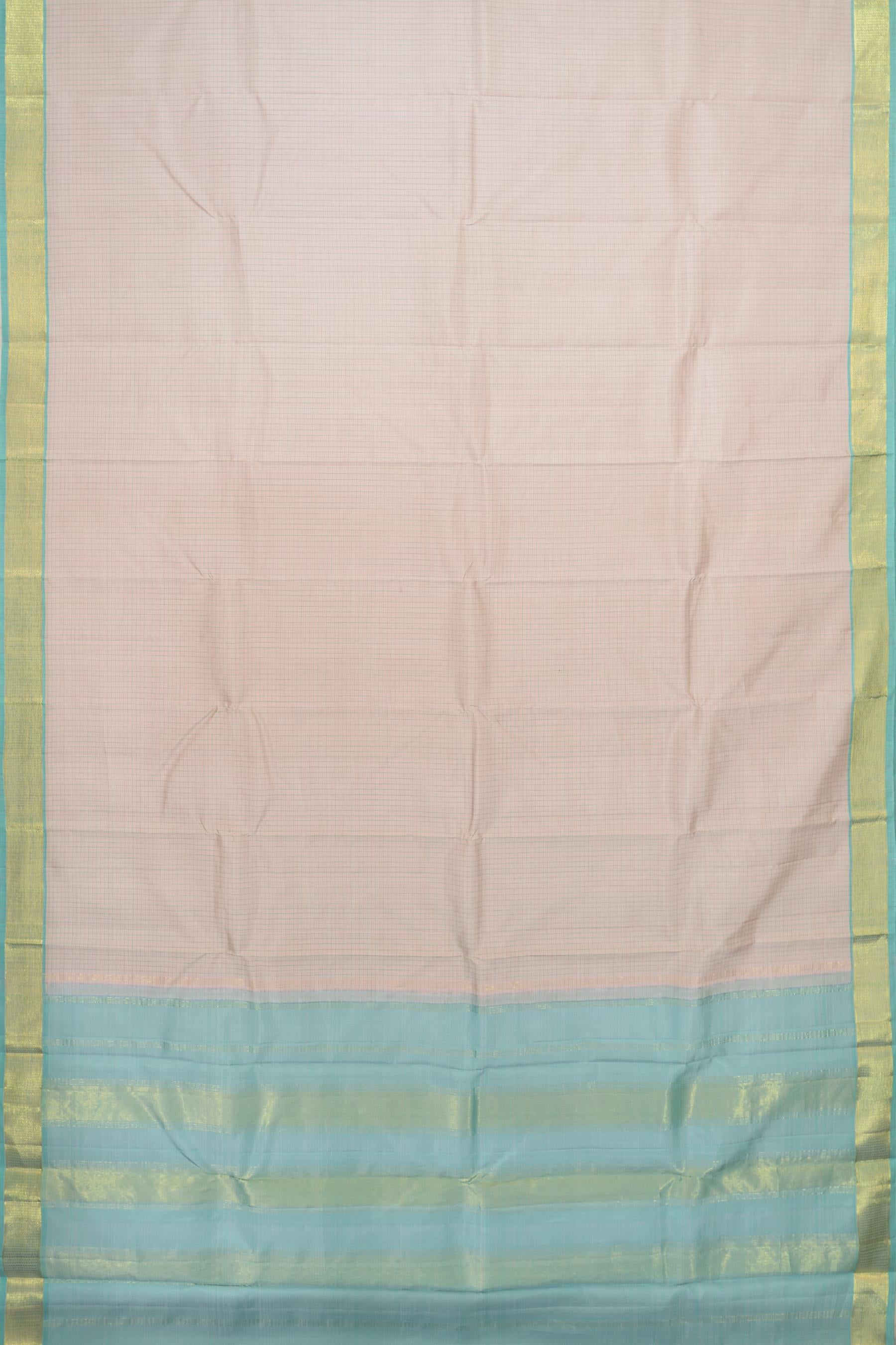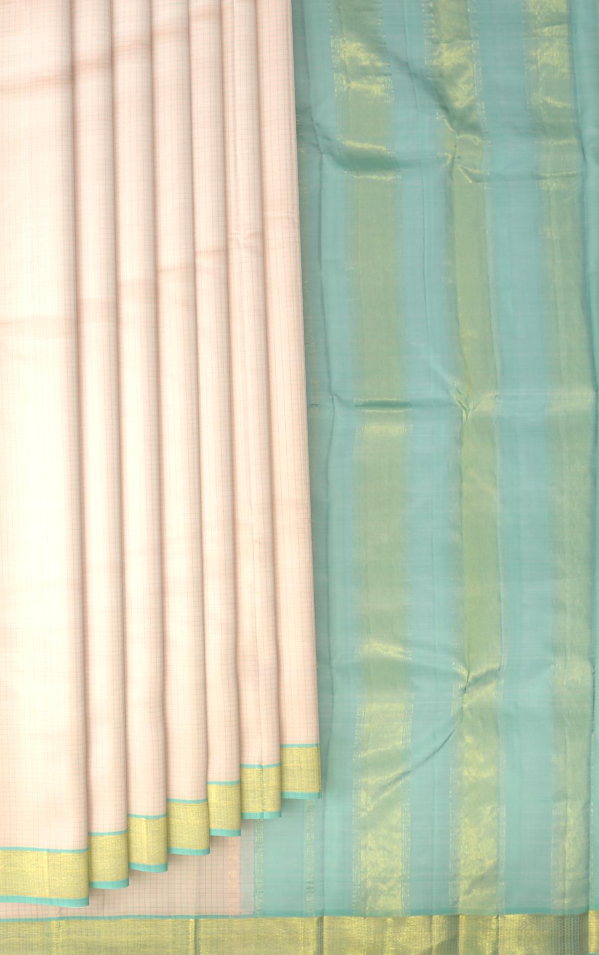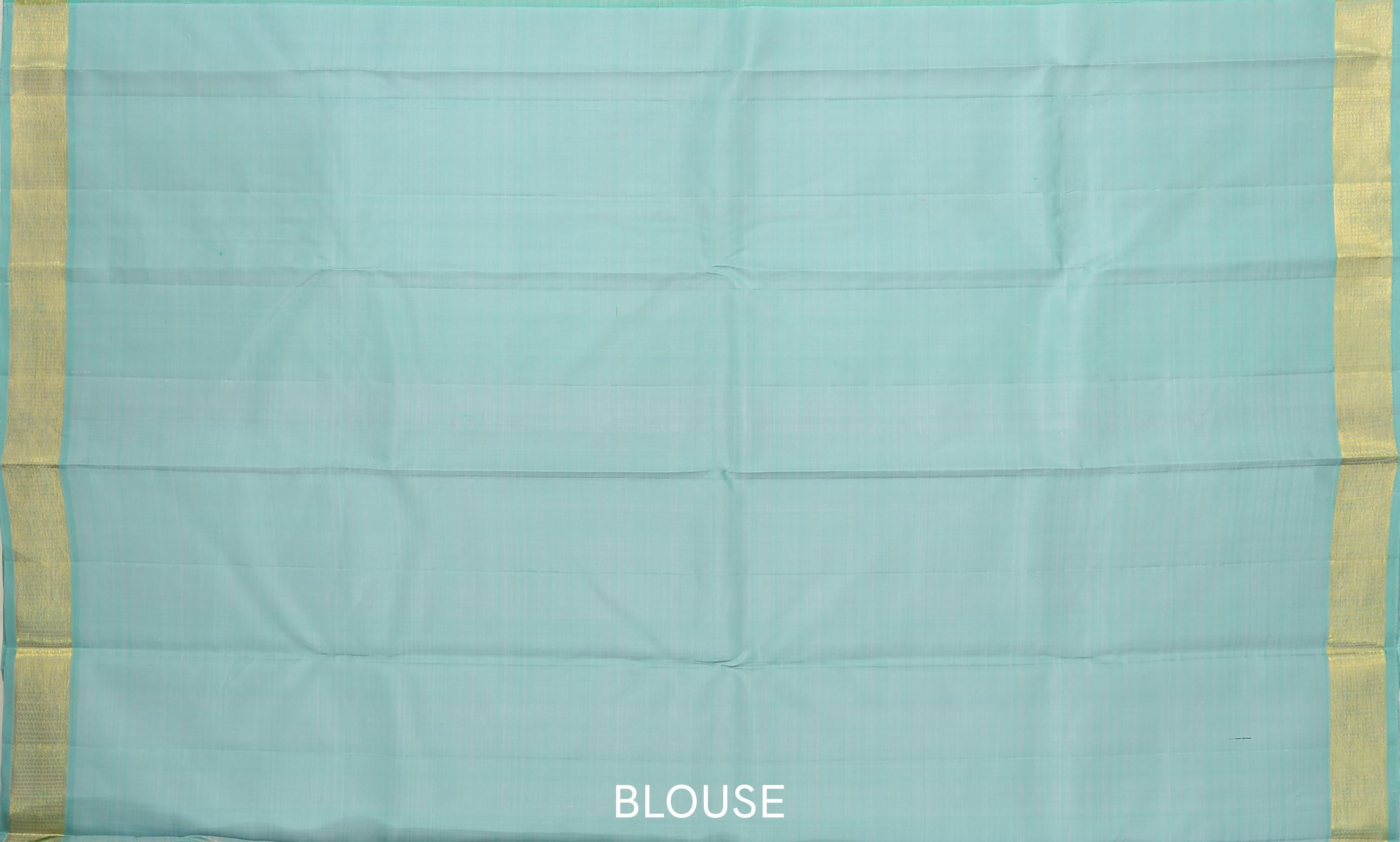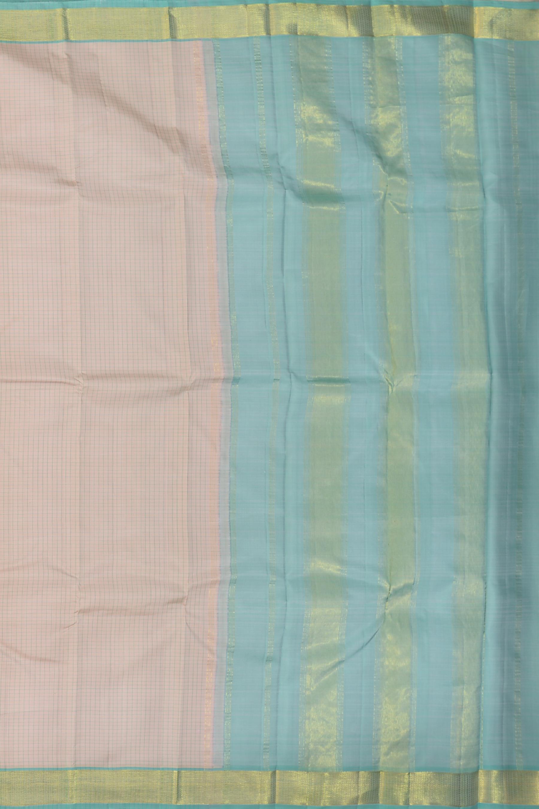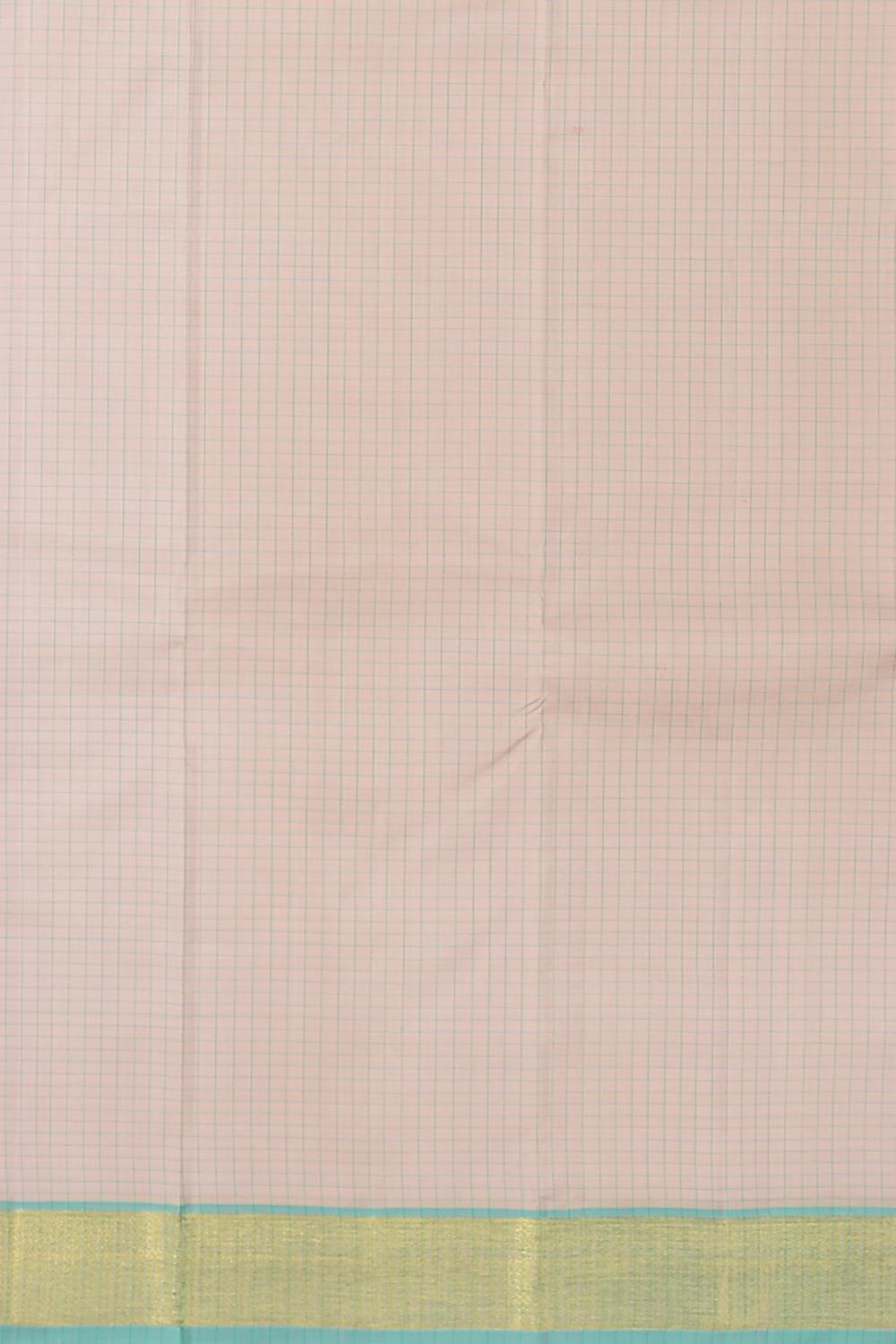 Immerse yourself in the soft embrace of dawn with this Pure Silk Saree, a delicate interplay of Light Pink and Light Turquoise Blue. The body, adorned with very small checks in blue, mirrors the early morning sky, scattered with fleeting clouds. The Light Turquoise Blue borders, enriched with the luxurious gleam of Getti Zari, frame this ethereal piece, reminiscent of the horizon where sea meets sky. The pallu, woven with Seer mundhi patterns in Getti Zari, cascades like a gentle wave, making this saree a poetic ode to the serene beauty of daybreak. Ideal for serene gatherings or daytime events, it promises elegance and a touch of the tranquil mystery of dawn.
