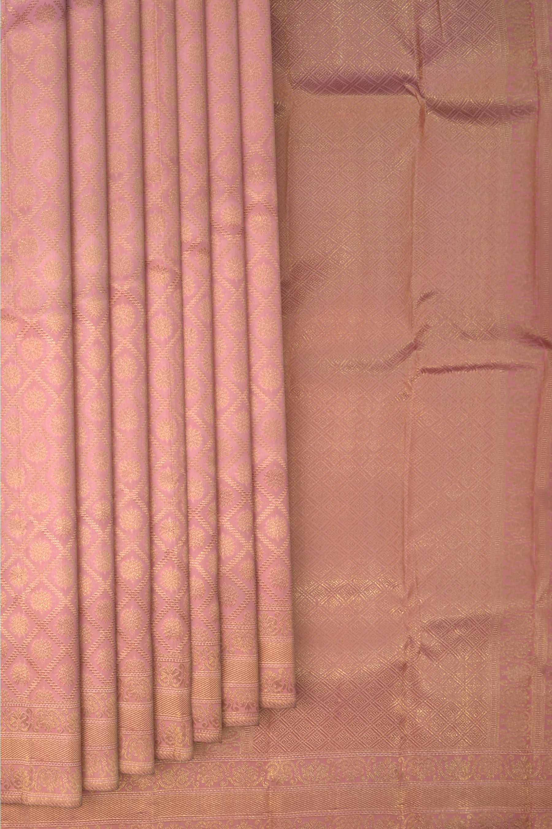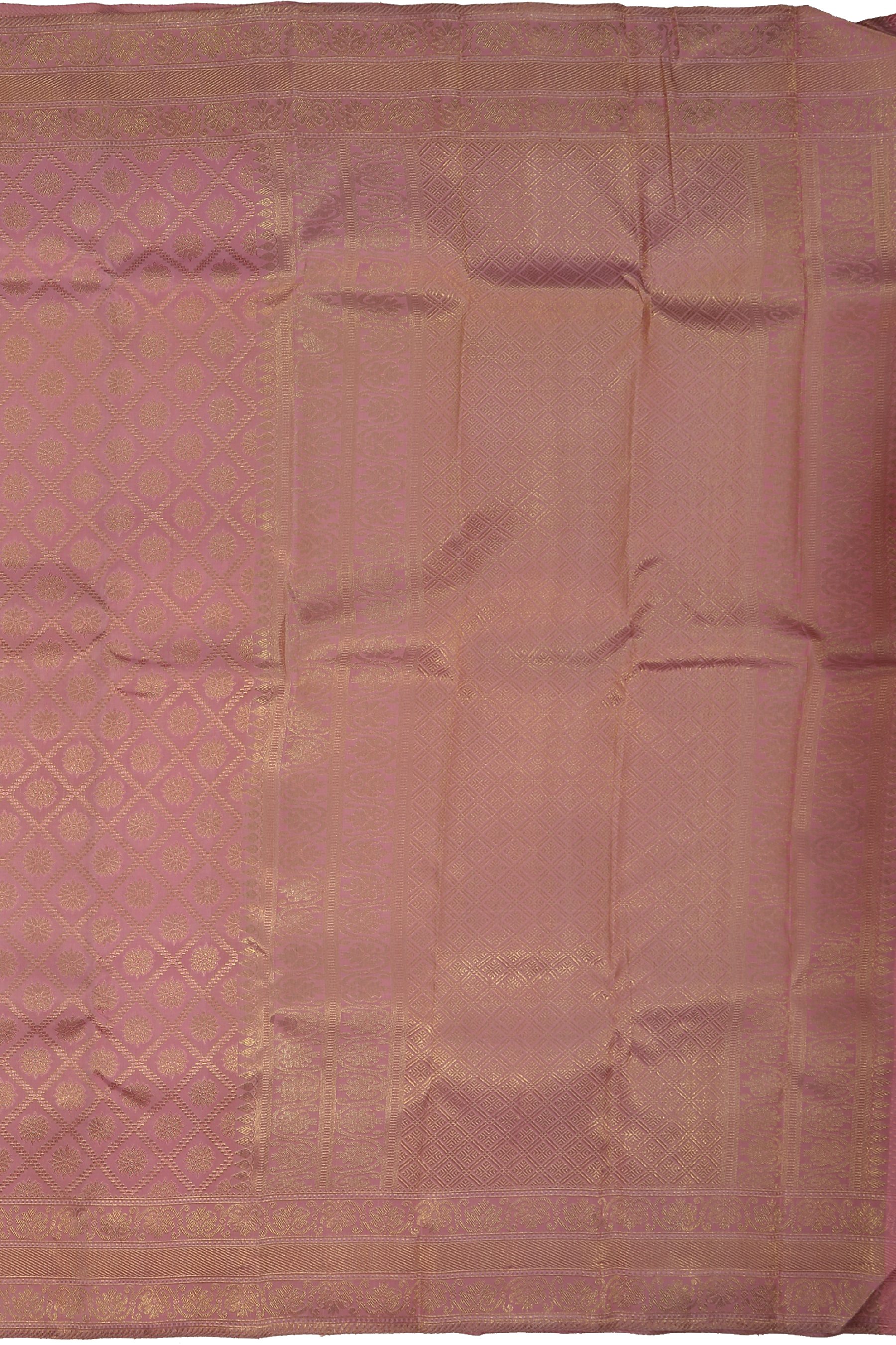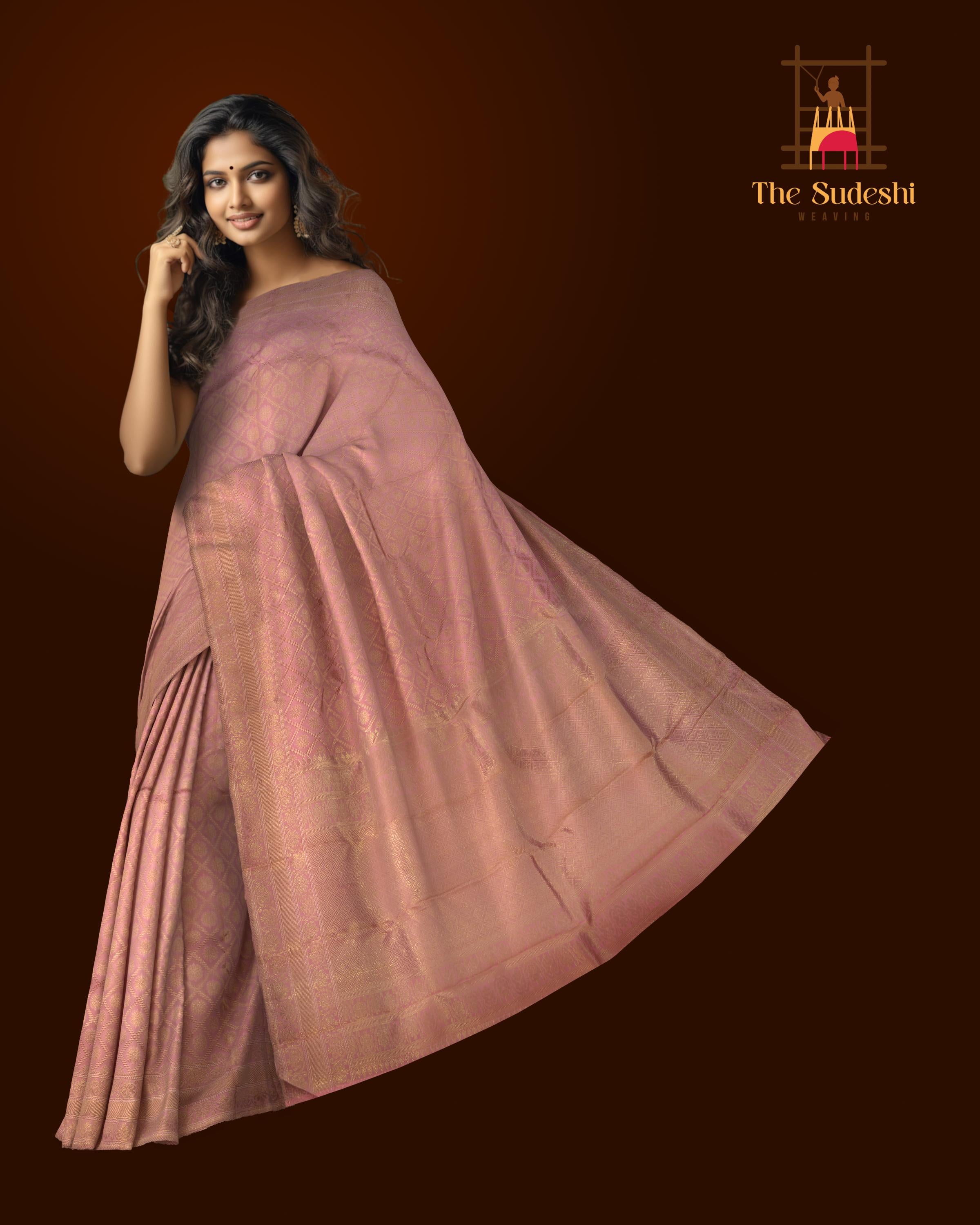 Step into a world of blooming flowers and soft mornings with this light blush pink Kanchipuram silk saree. Like petals caressed by the morning dew, this saree brings forth stories of gardens, nature, and undying love.