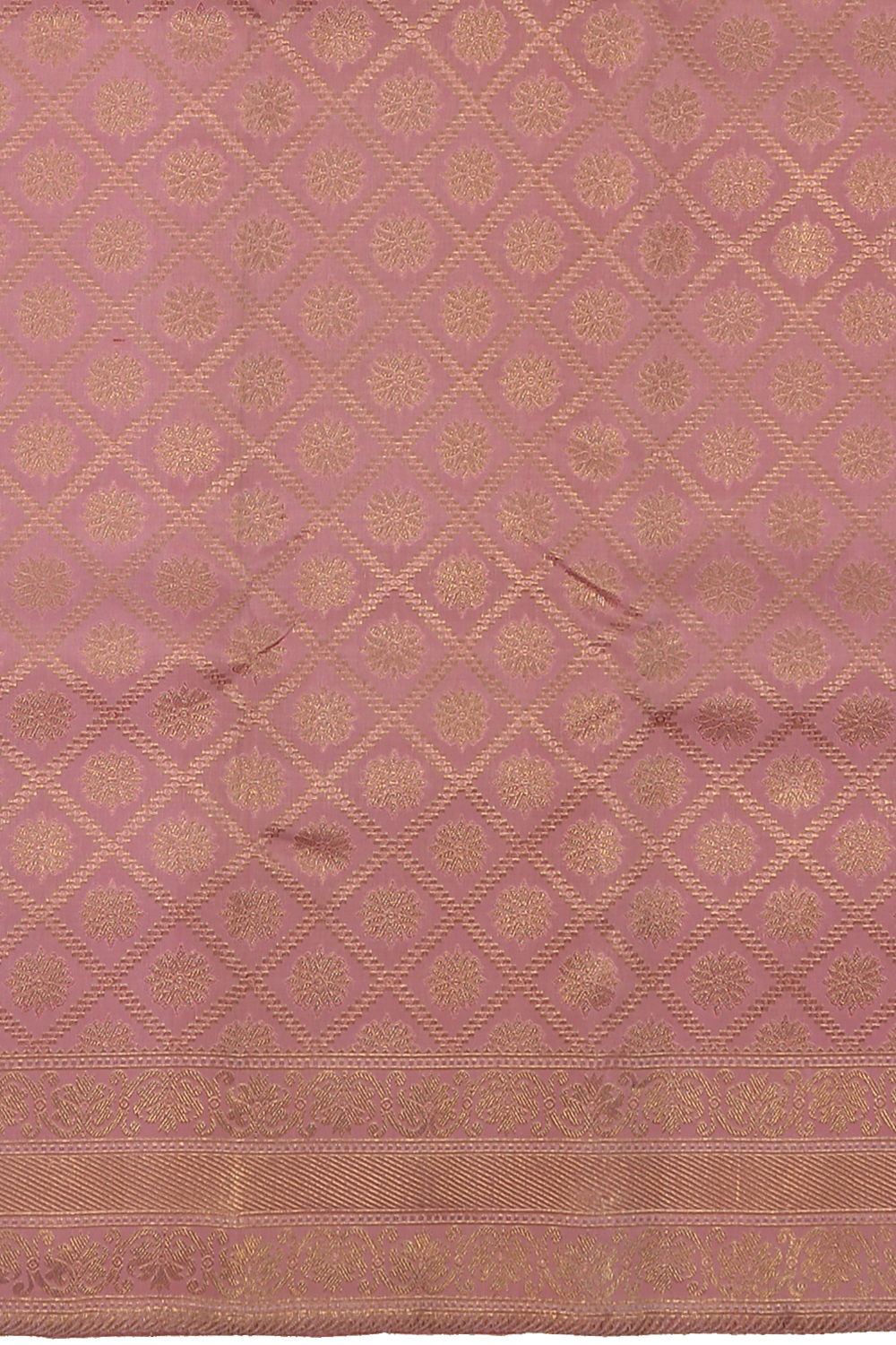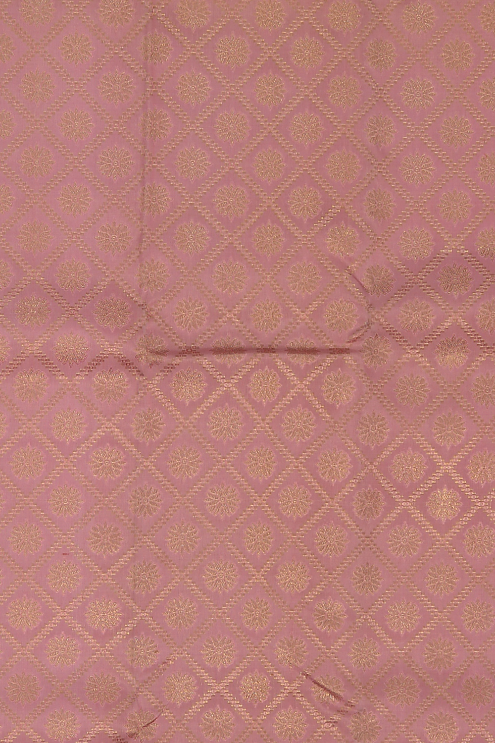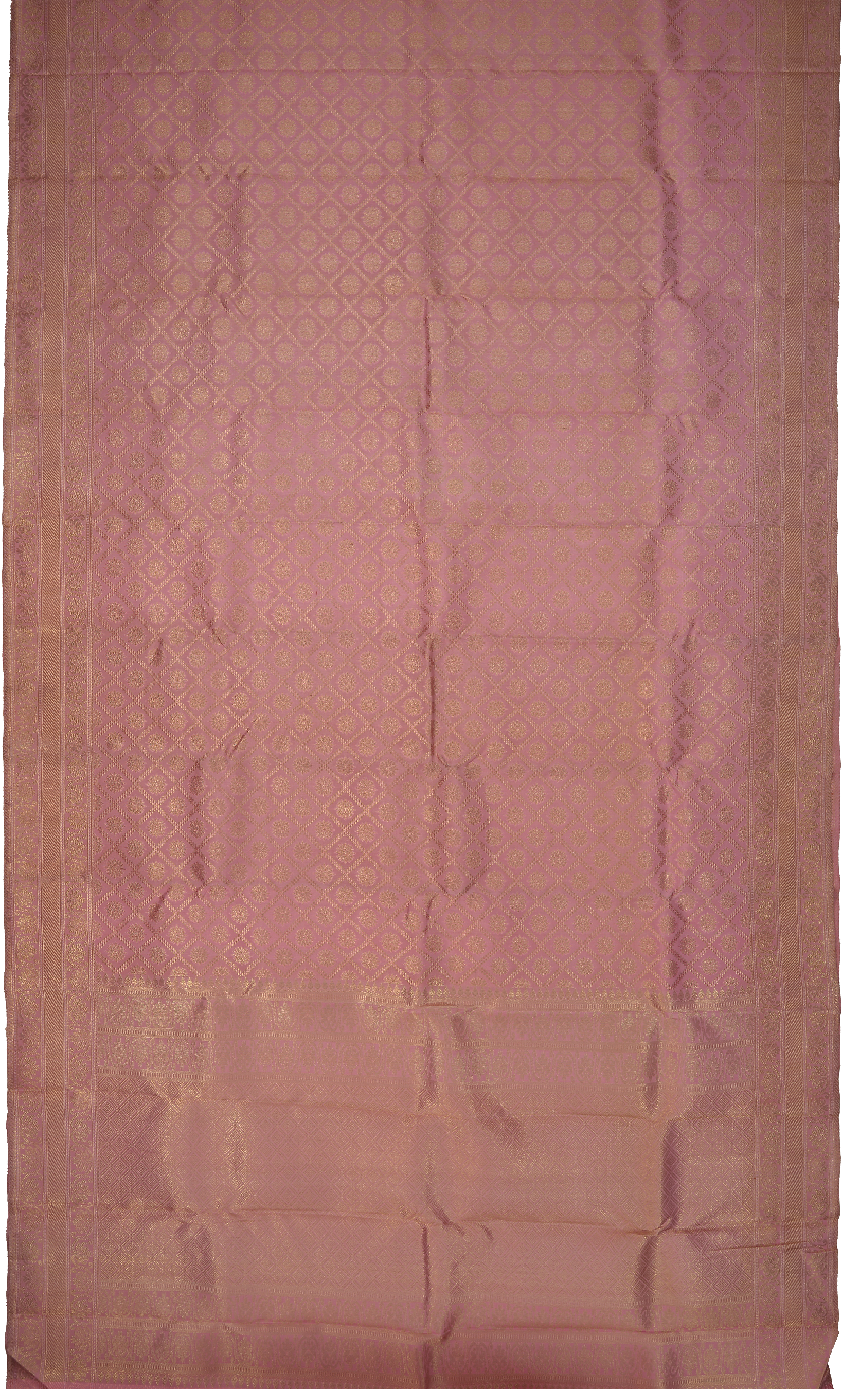 Step into a world of blooming flowers and soft mornings with this light blush pink Kanchipuram silk saree. Like petals caressed by the morning dew, this saree brings forth stories of gardens, nature, and undying love.