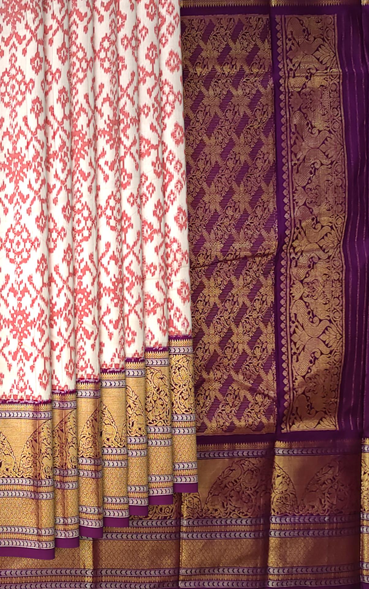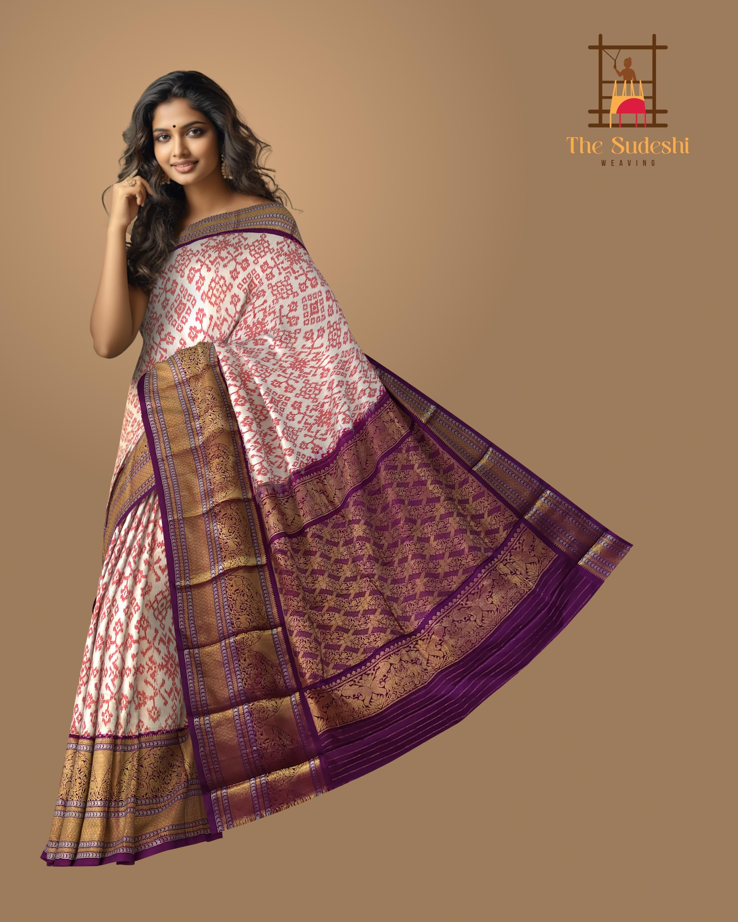 Experience timeless beauty with our White and Deep Purple Kanchi Border Pochampally Saree. The pristine white body is elegantly accentuated by a deep purple Kanchi border and pallu, creating a classic and regal look. Perfect for festivals and social events, this saree features the Navaratna body design, symbolizing the nine gems, adding a touch of auspiciousness and tradition to your attire.