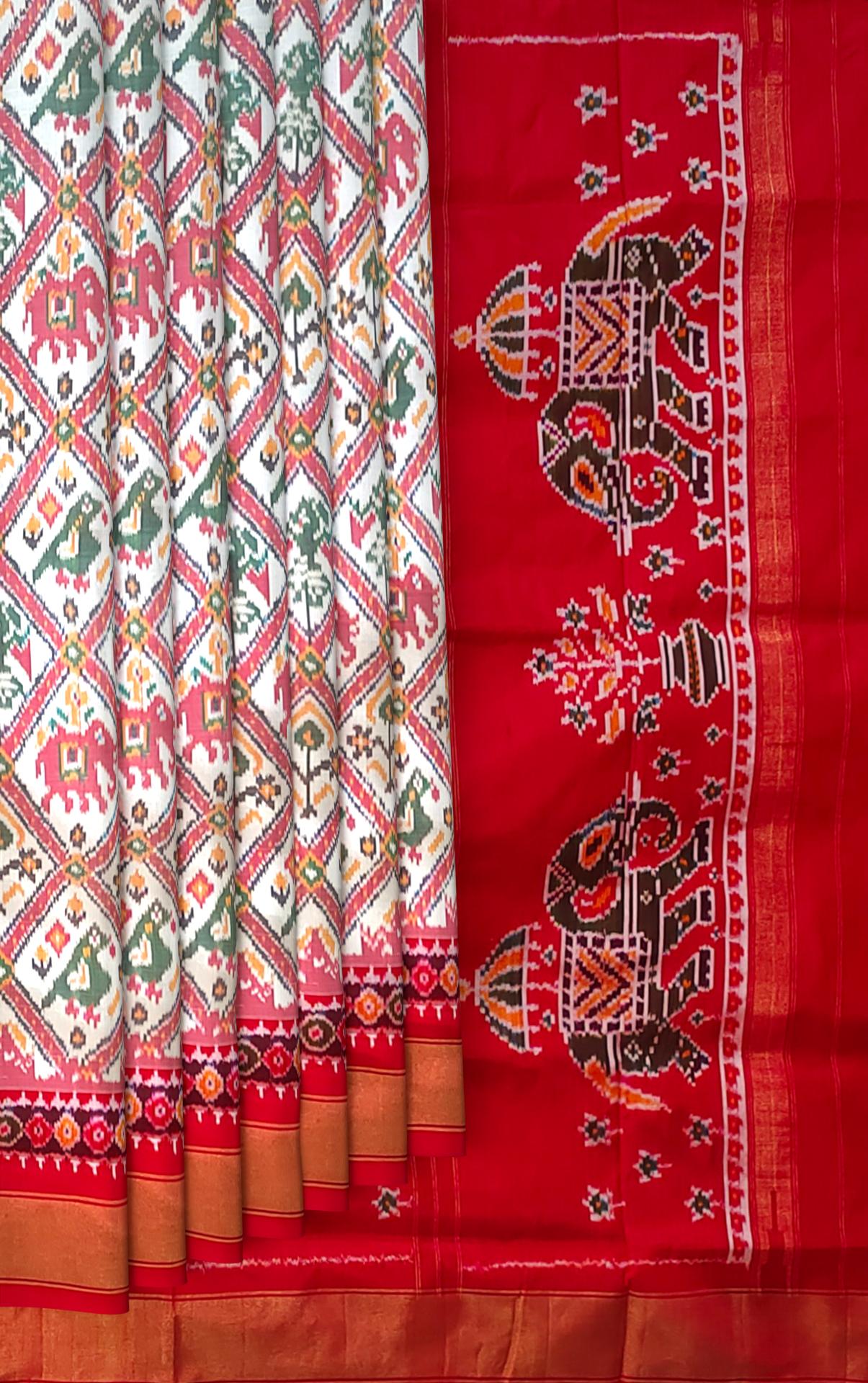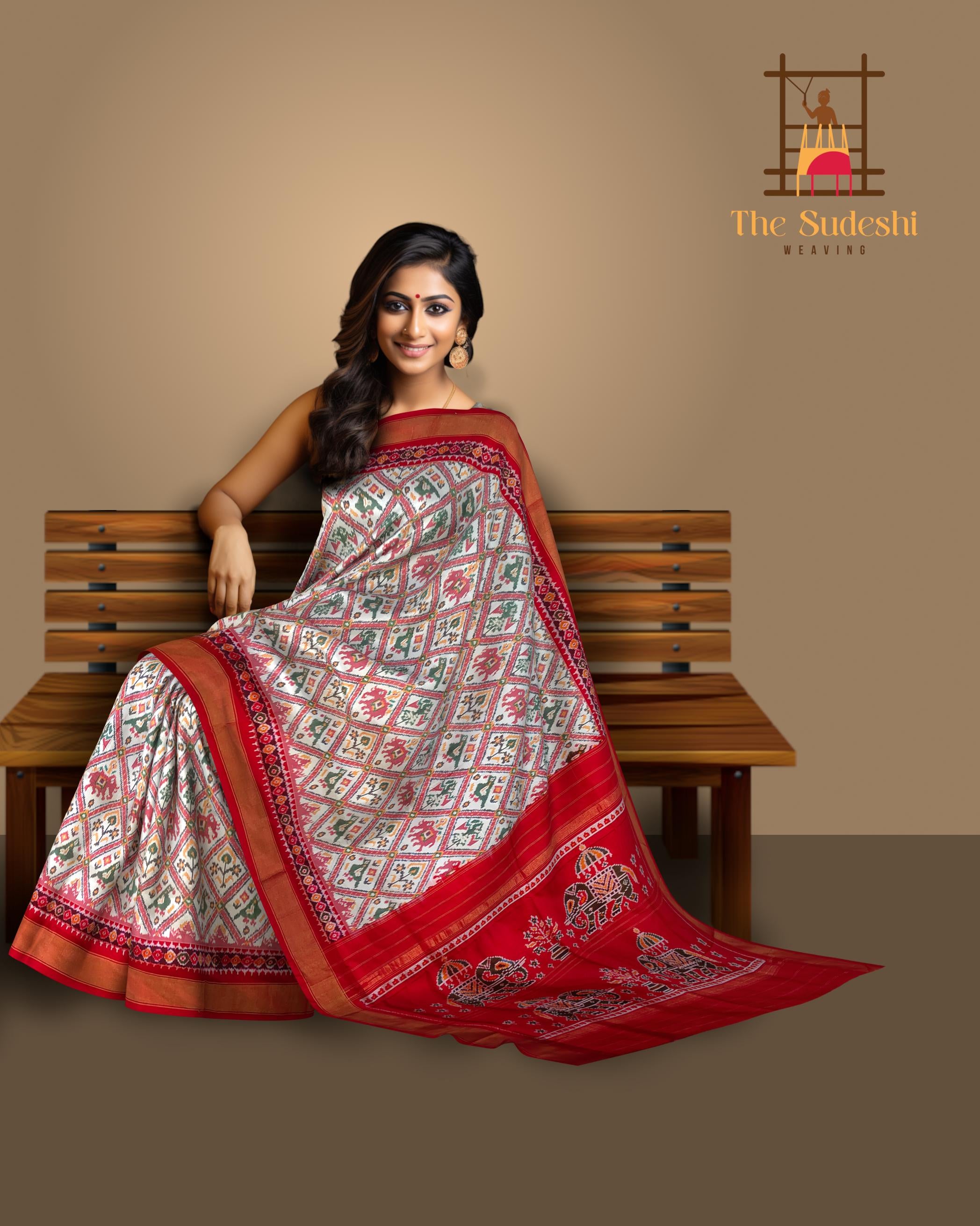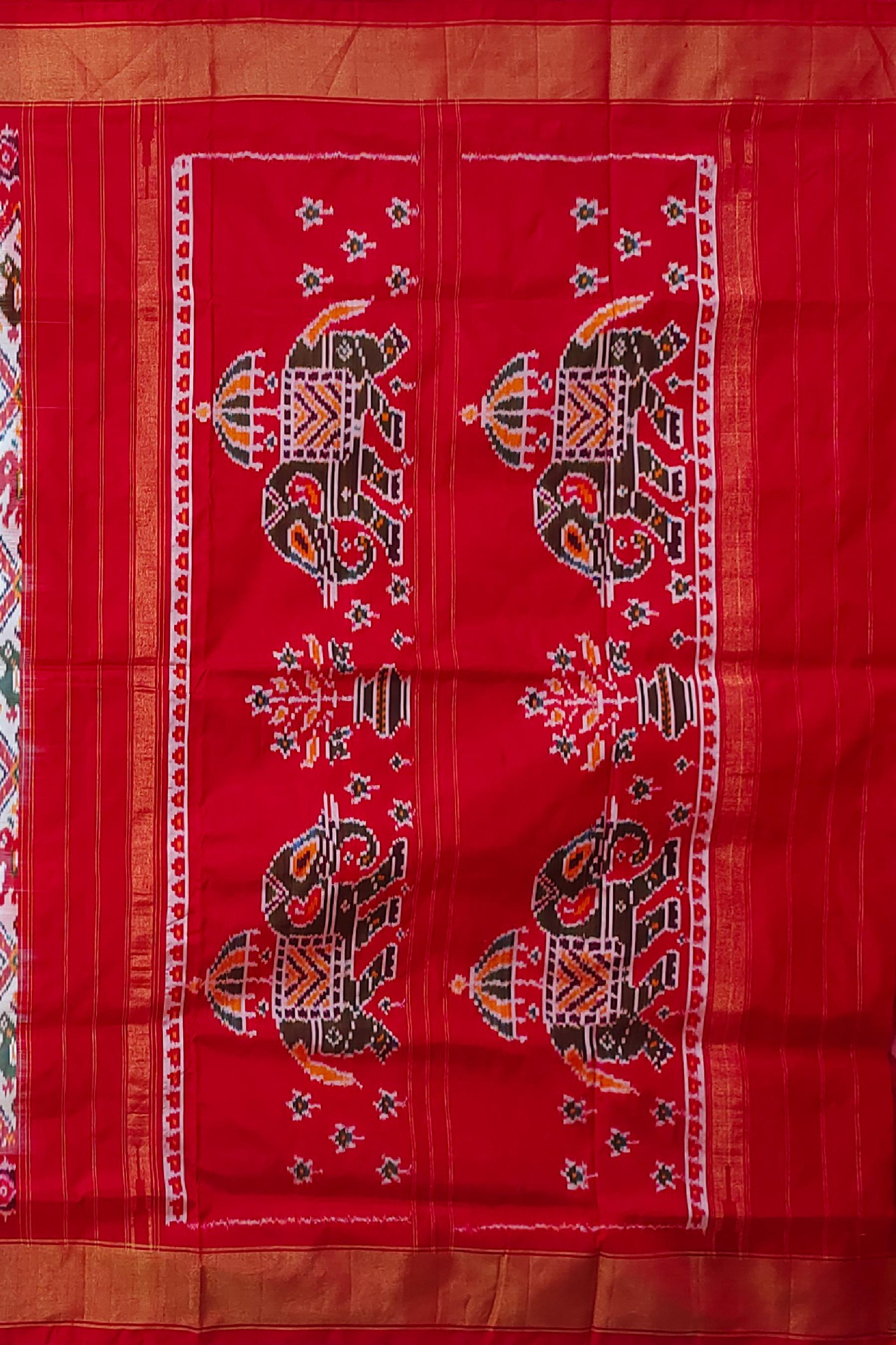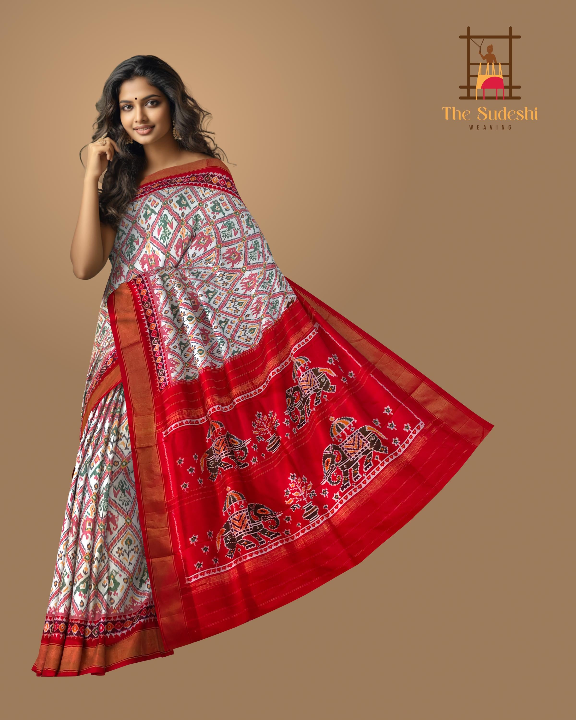 Embrace the timeless beauty of our White and Red Narikunju Pochampally Saree. The pristine white body is elegantly contrasted by a vibrant red pallu and blouse, creating a classic and sophisticated look. Ideal for festivals and social events, this saree features the Narikunju body design with an Ambari pallu, adding a touch of traditional charm to your ensemble.
