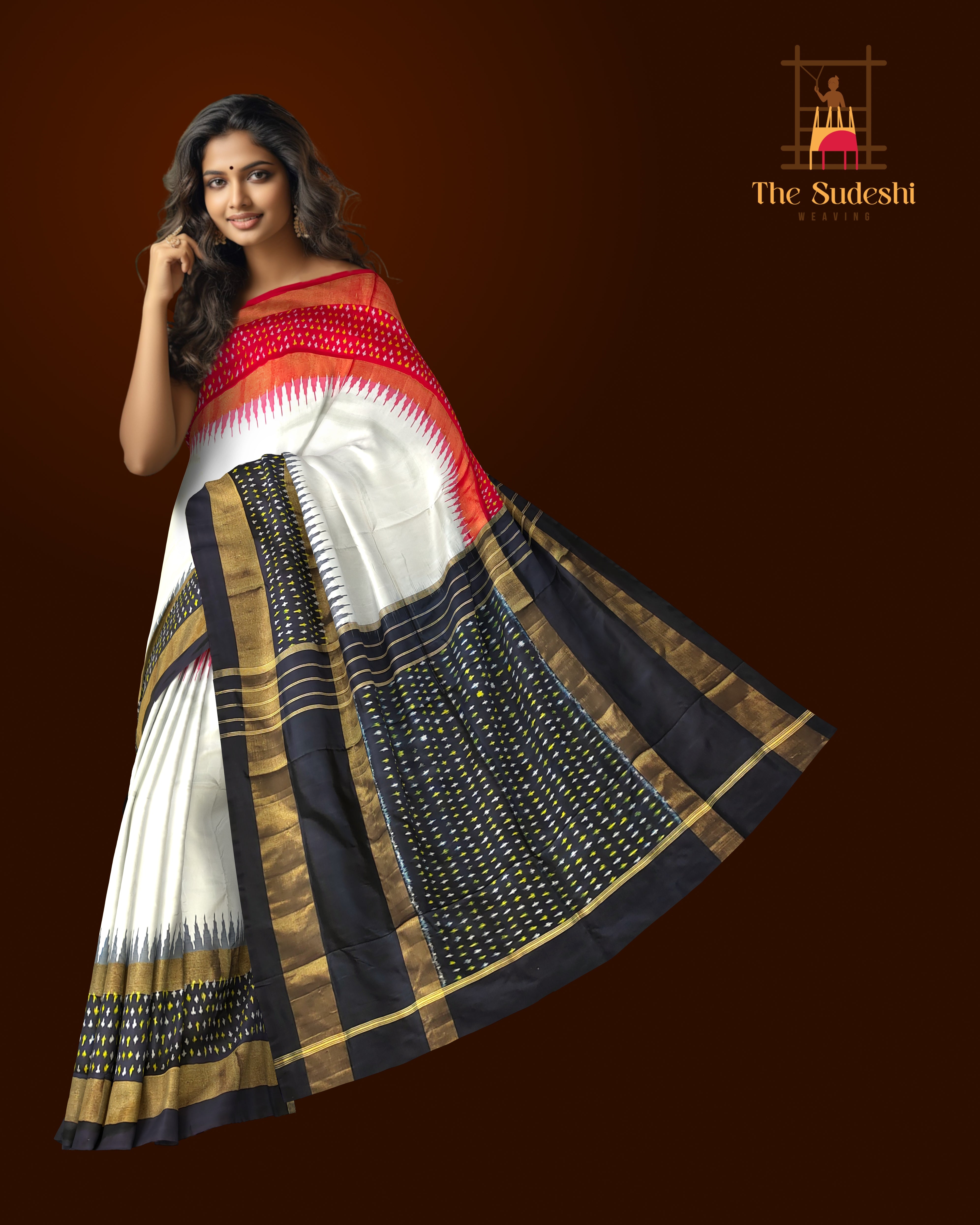This stunning White Black Pochampally Single Ikat Handloom Saree is a beautiful piece that showcases the artistry of traditional Indian craftsmanship. The saree features intricate gold zari work on a white and black background, creating a striking contrast that exudes elegance and sophistication.