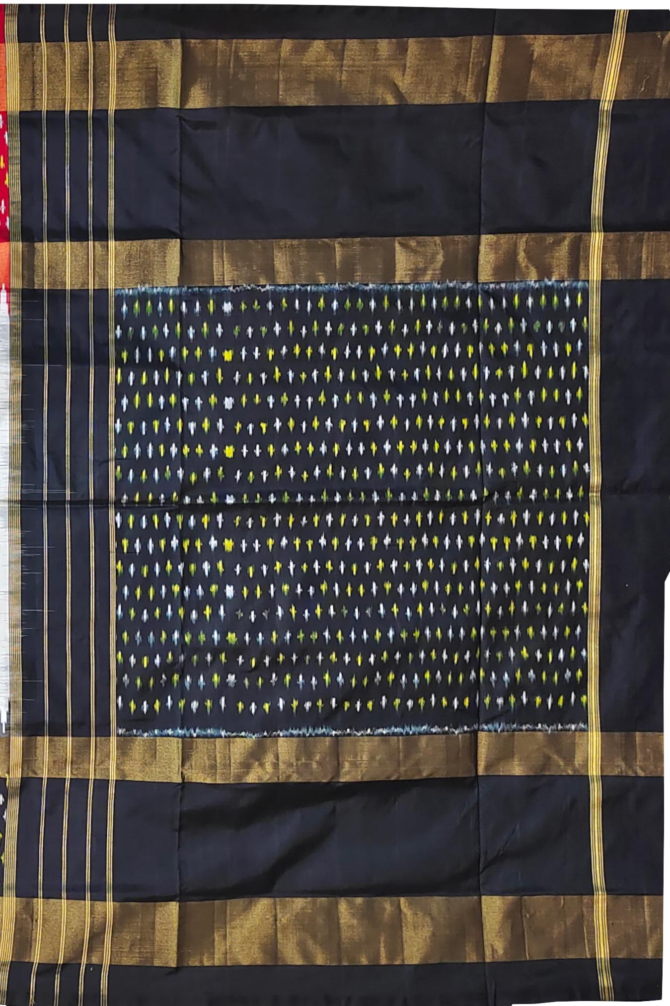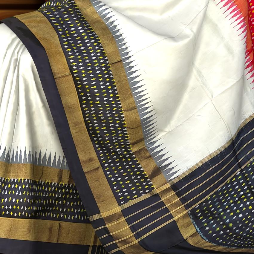 This stunning White Black Pochampally Single Ikat Handloom Saree is a beautiful piece that showcases the artistry of traditional Indian craftsmanship. The saree features intricate gold zari work on a white and black background, creating a striking contrast that exudes elegance and sophistication. The Pochampally weaving technique, originating from the...