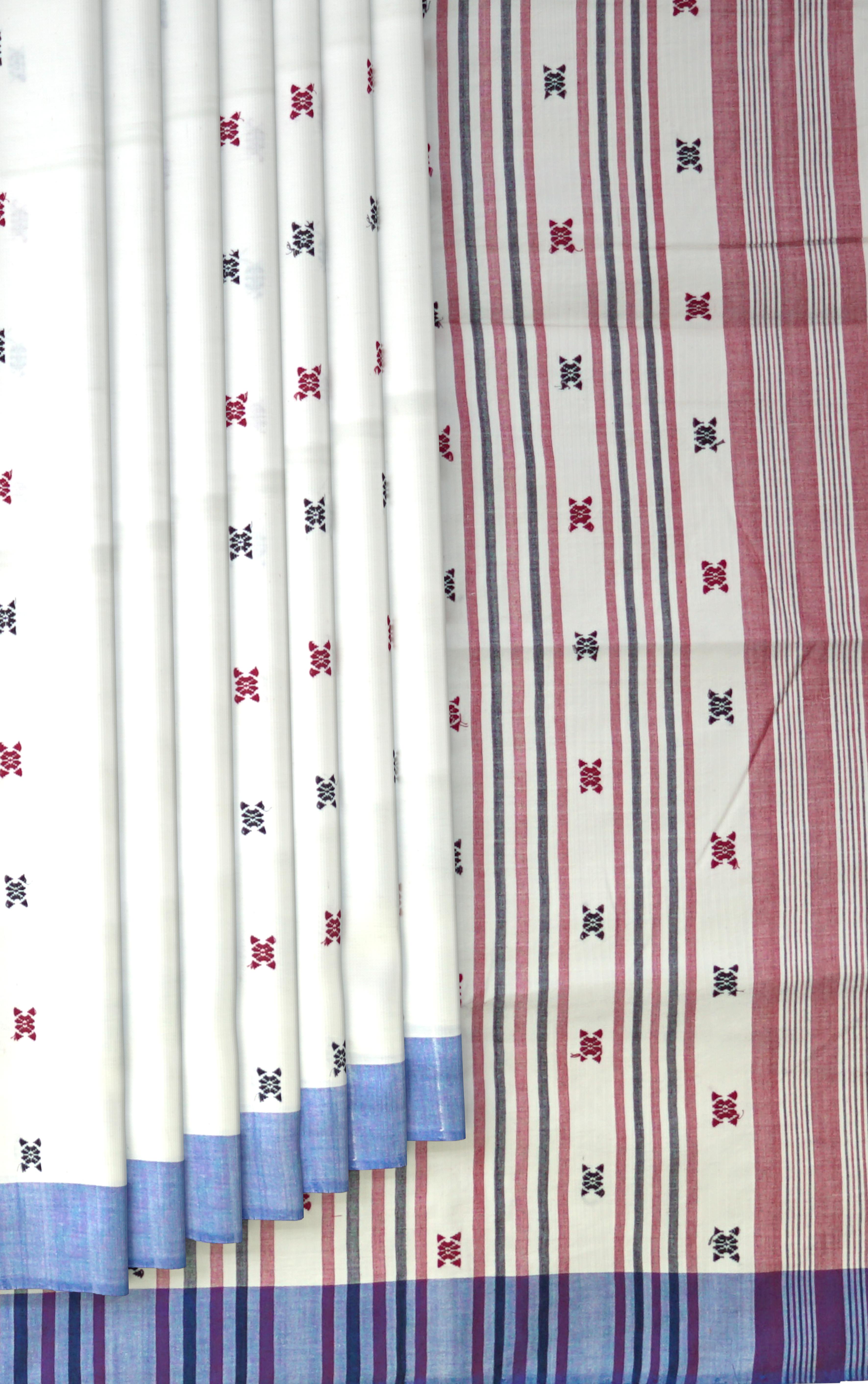 The motifs on this saree are inspired by Assamese culture and nature, featuring geometric and stylized patterns that symbolize flowers, plants, and traditional artifacts. These motifs, woven using the extra-weft technique, add a raised, embossed effect that enhances the saree's texture and depth. The combination of white and blue is both classic and contemporary, appealing to women of all ages.