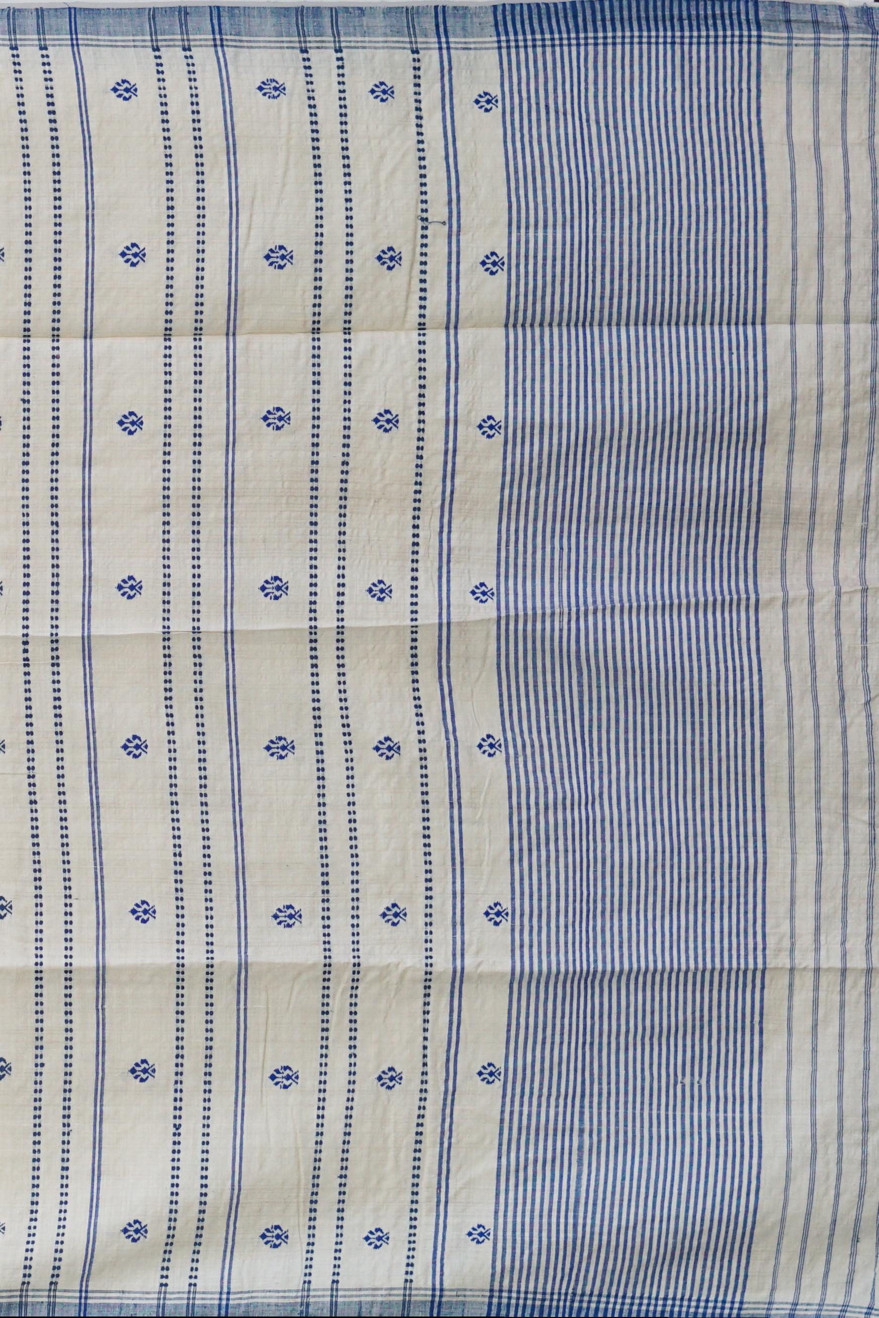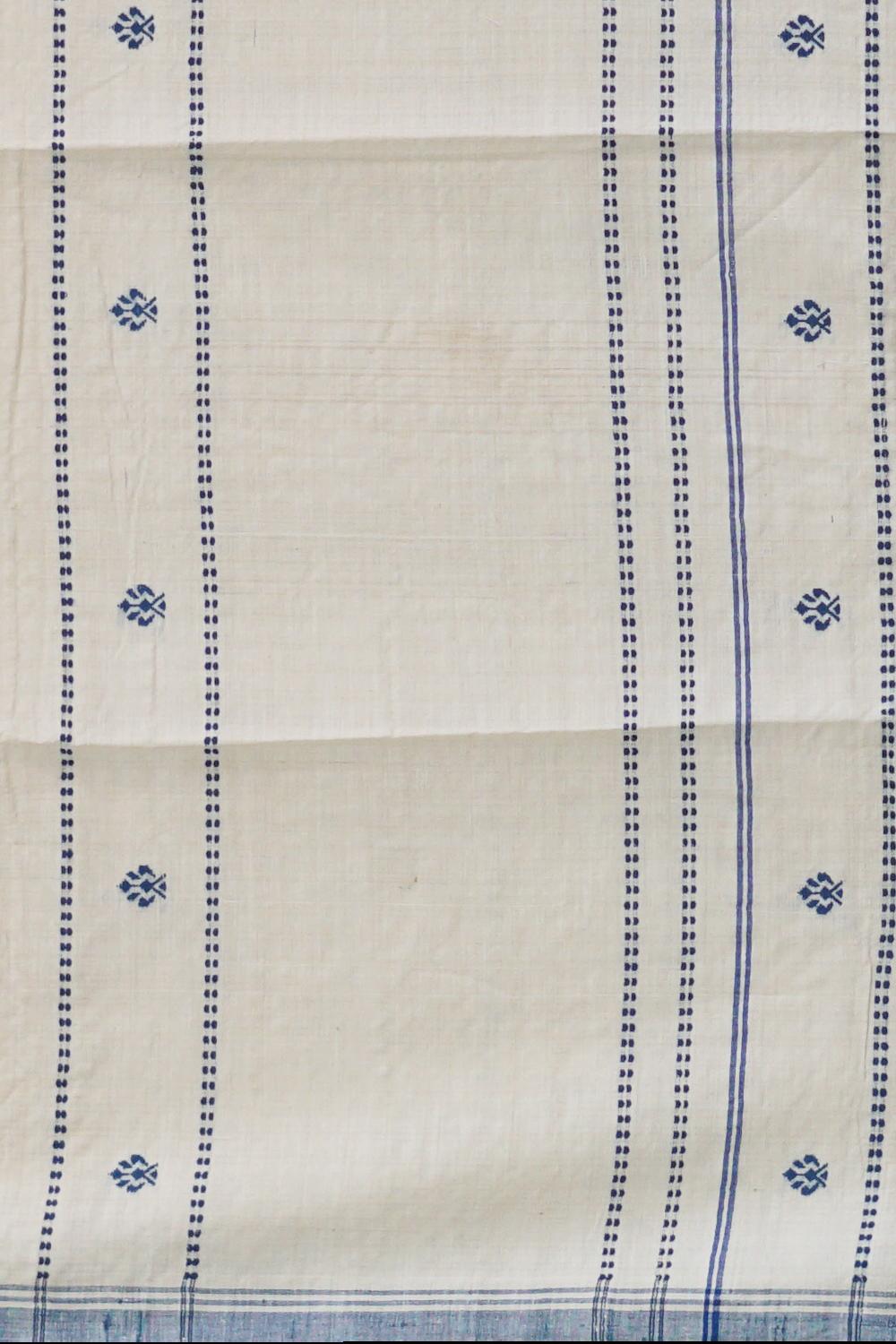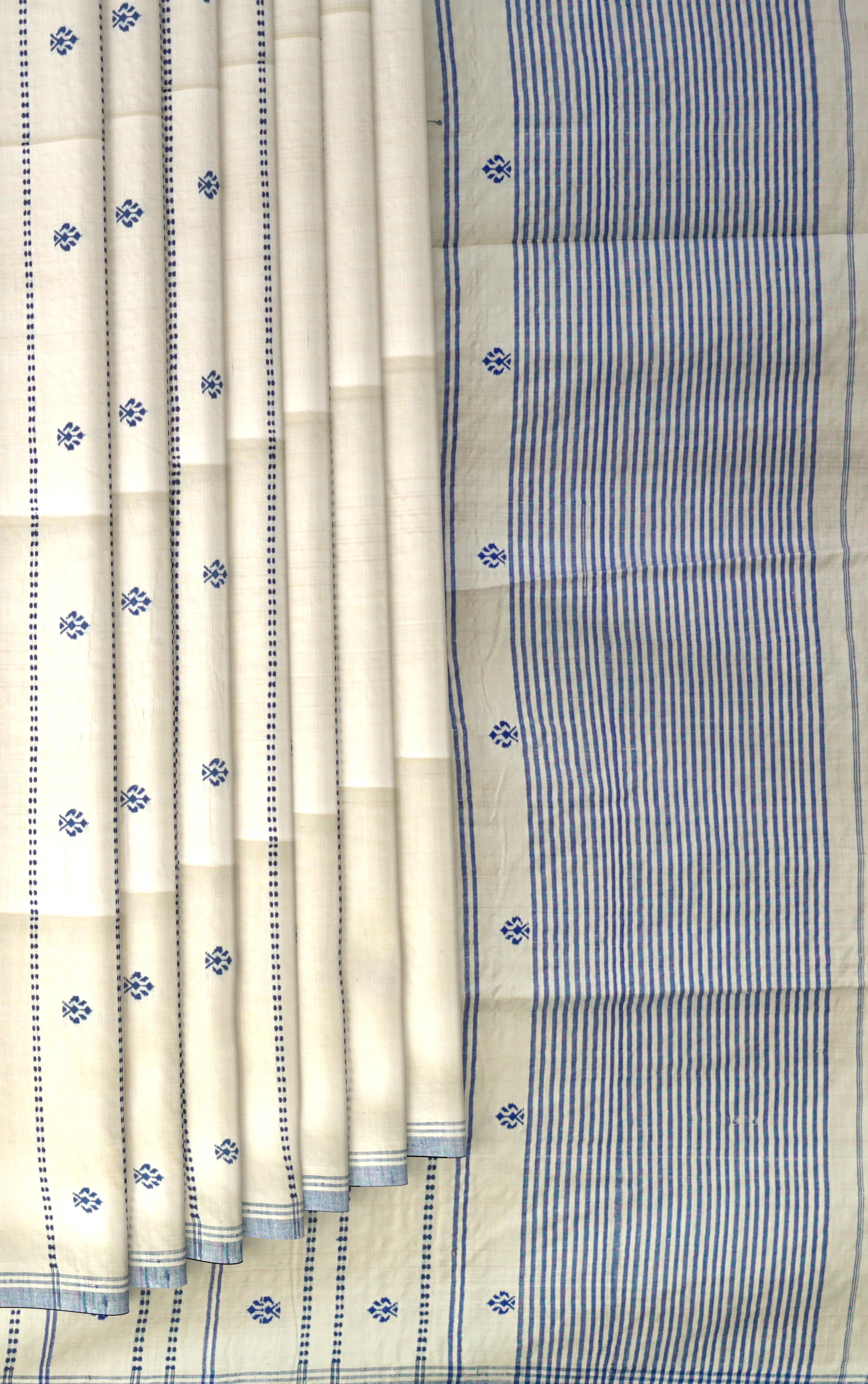 Embrace the serene beauty of our White Eri Silk Saree with a Blue Border, a true representation of Assamese craftsmanship. This saree is woven with care using Eri silk, known for its softness and ethical production process. The white body of the saree, decorated with delicate buttis, creates a harmonious and elegant look, while the contrasting blue border adds a touch of sophistication and grace.