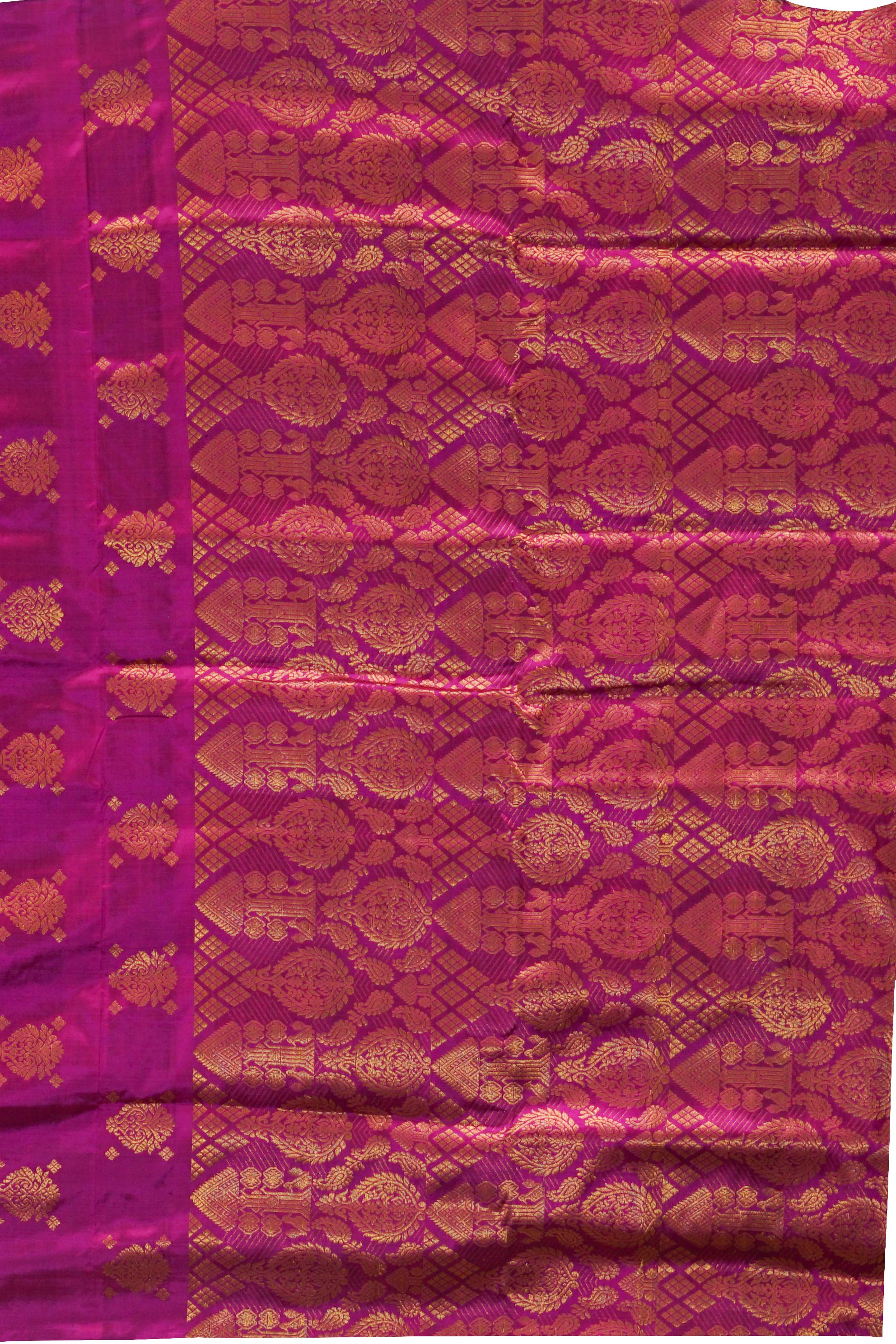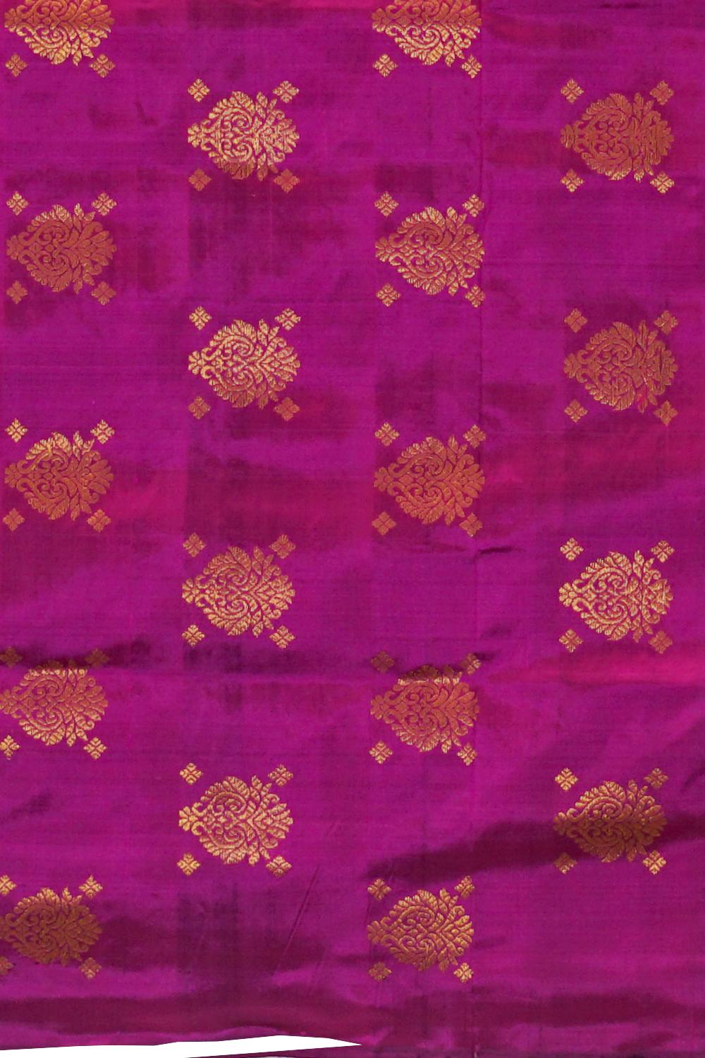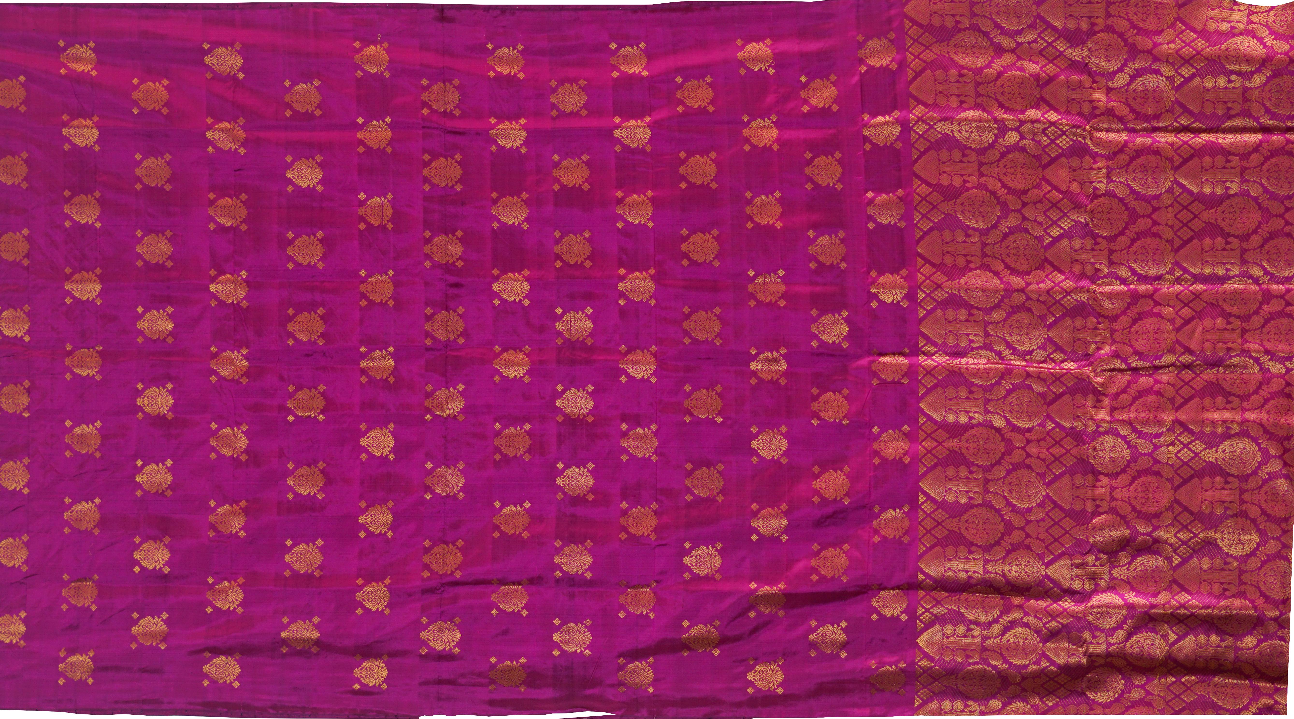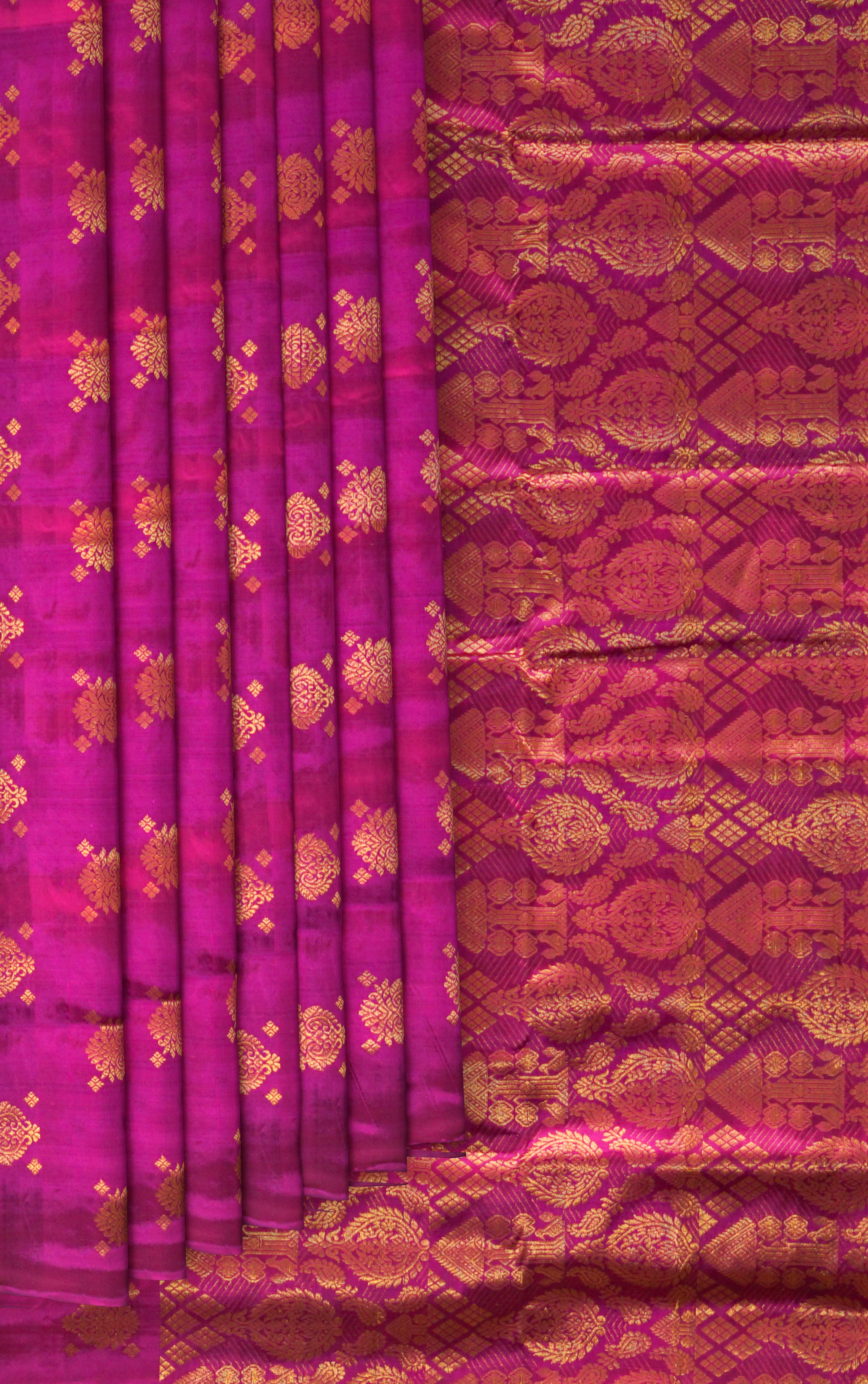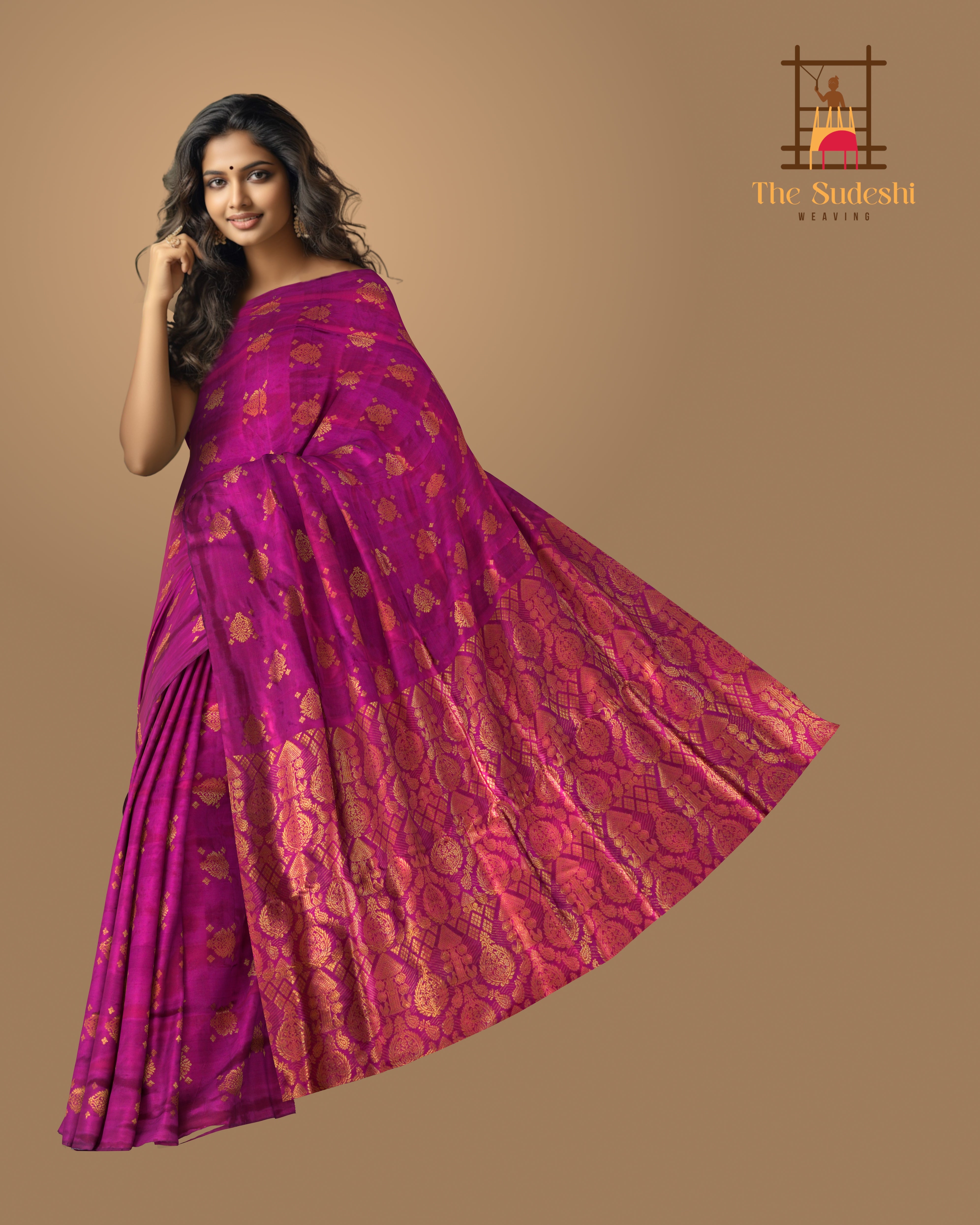 The motifs on this saree are inspired by Assamese culture and nature, featuring geometric and stylized patterns that symbolize flowers, plants, and traditional artifacts. These motifs, woven using the extra-weft technique and local zari, add a raised, embossed effect that enhances the saree's texture and depth. The combination of magenta and brown is both regal and contemporary, appealing to women of all ages.