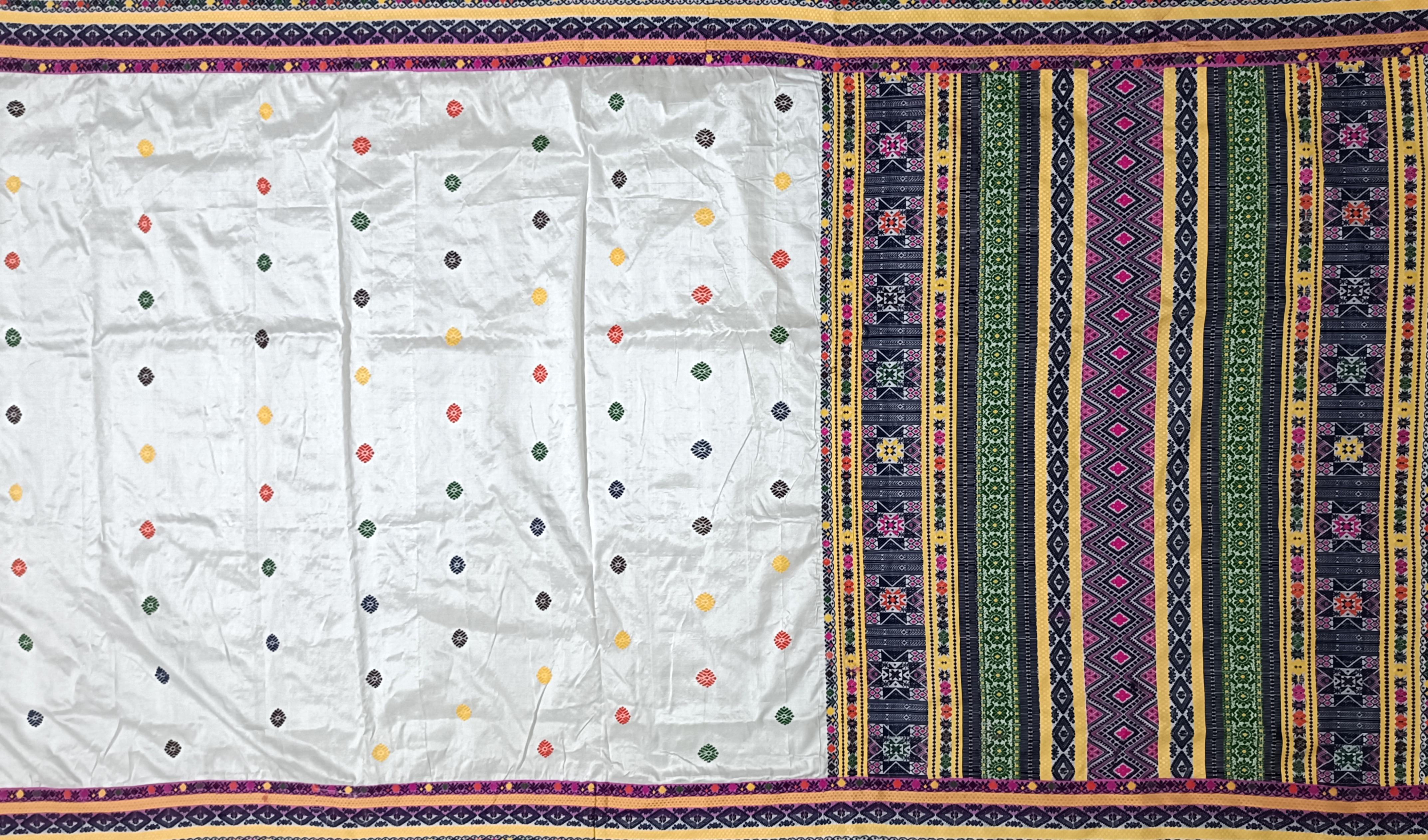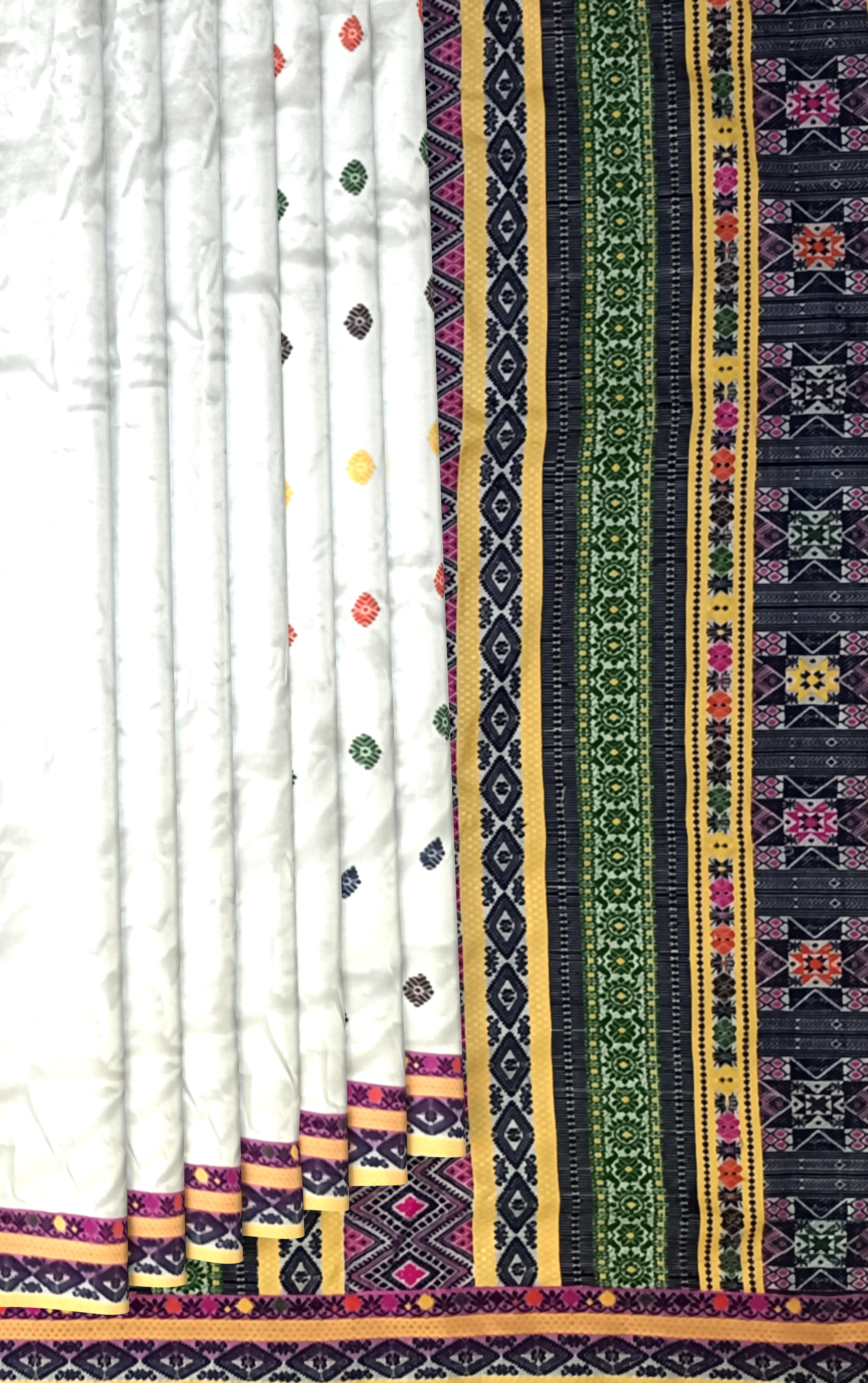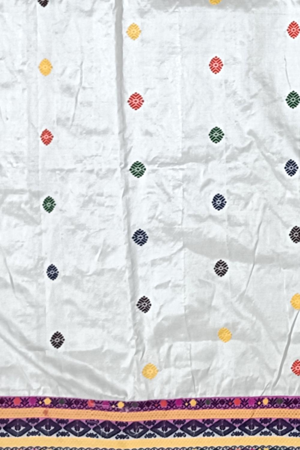 Step into elegance with this white Mulberry saree from Assam, featuring a vibrant multicolor border and pallu. The saree’s body, adorned with intricate buttis and motifs, provides a pristine canvas for the lively accents of the multicolor design. This blend of simplicity and vibrancy makes it a unique piece of art.