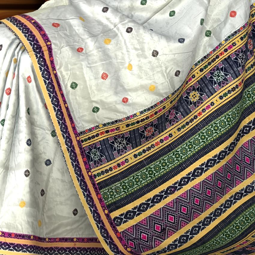 Mulberry sarees from Assam are cherished for their soft texture, natural sheen, and cultural importance. The multicolor accents in this saree signify celebration and festivity, while the detailed motifs represent Assamese traditions, offering a blend of heritage and modernity.