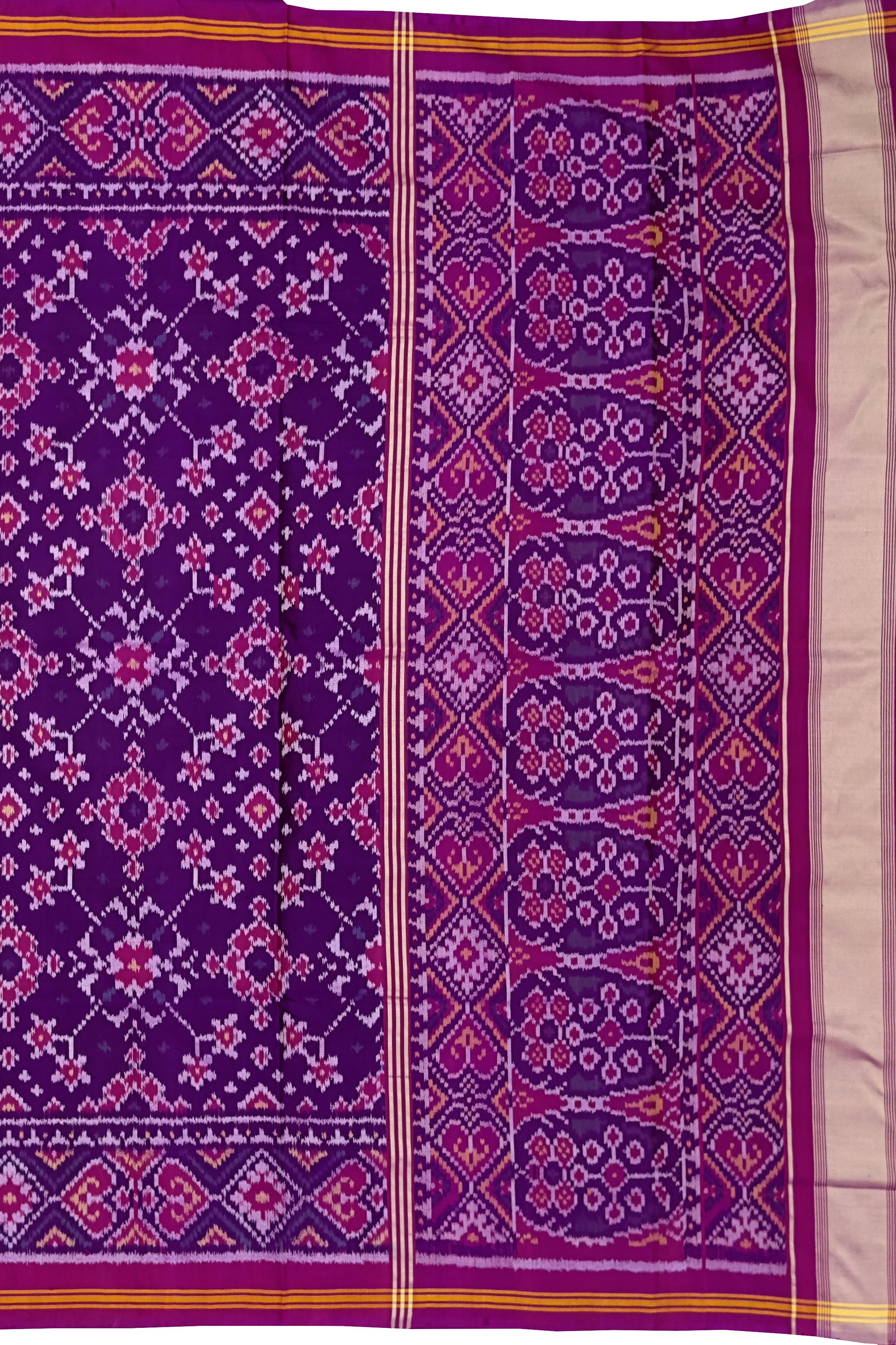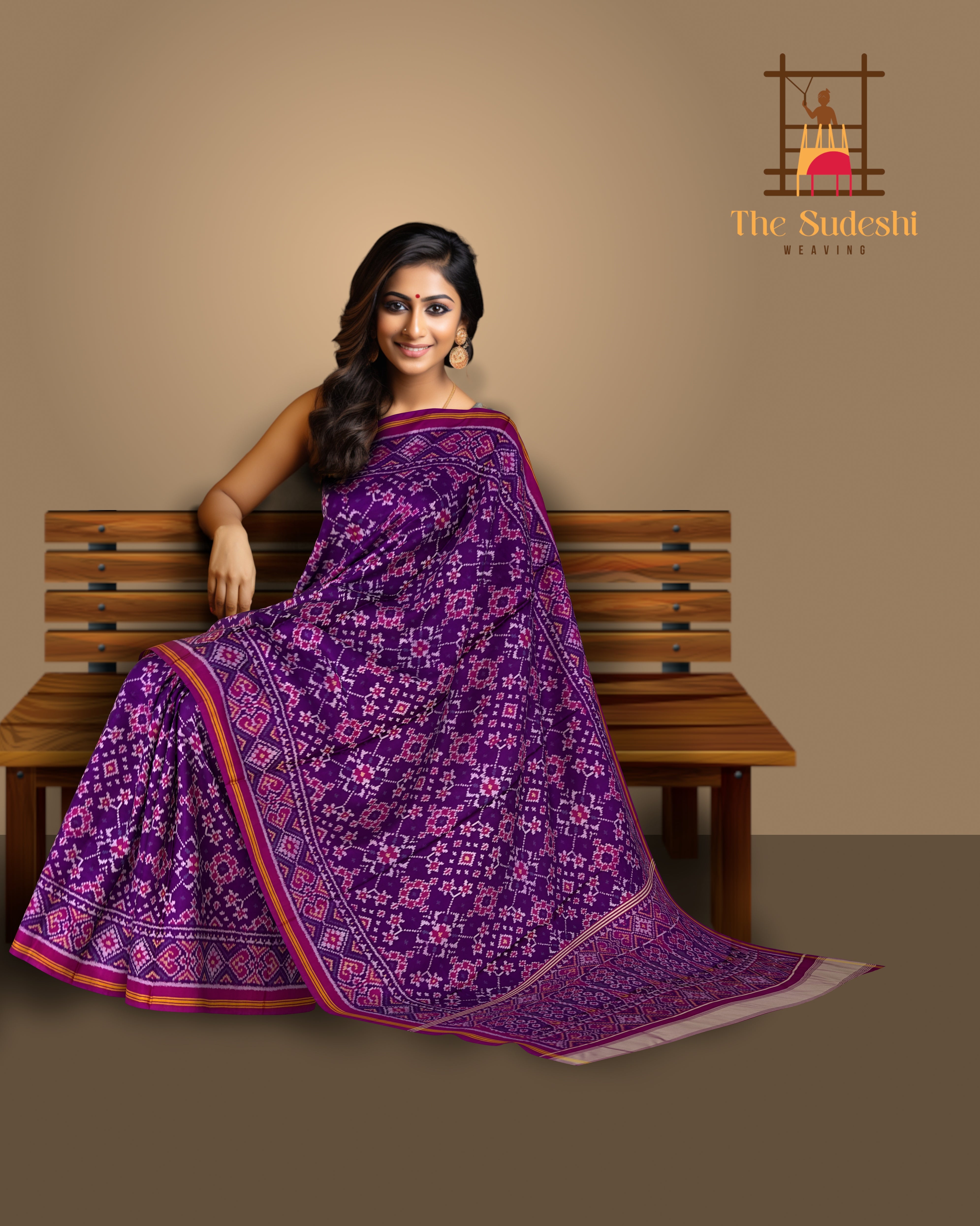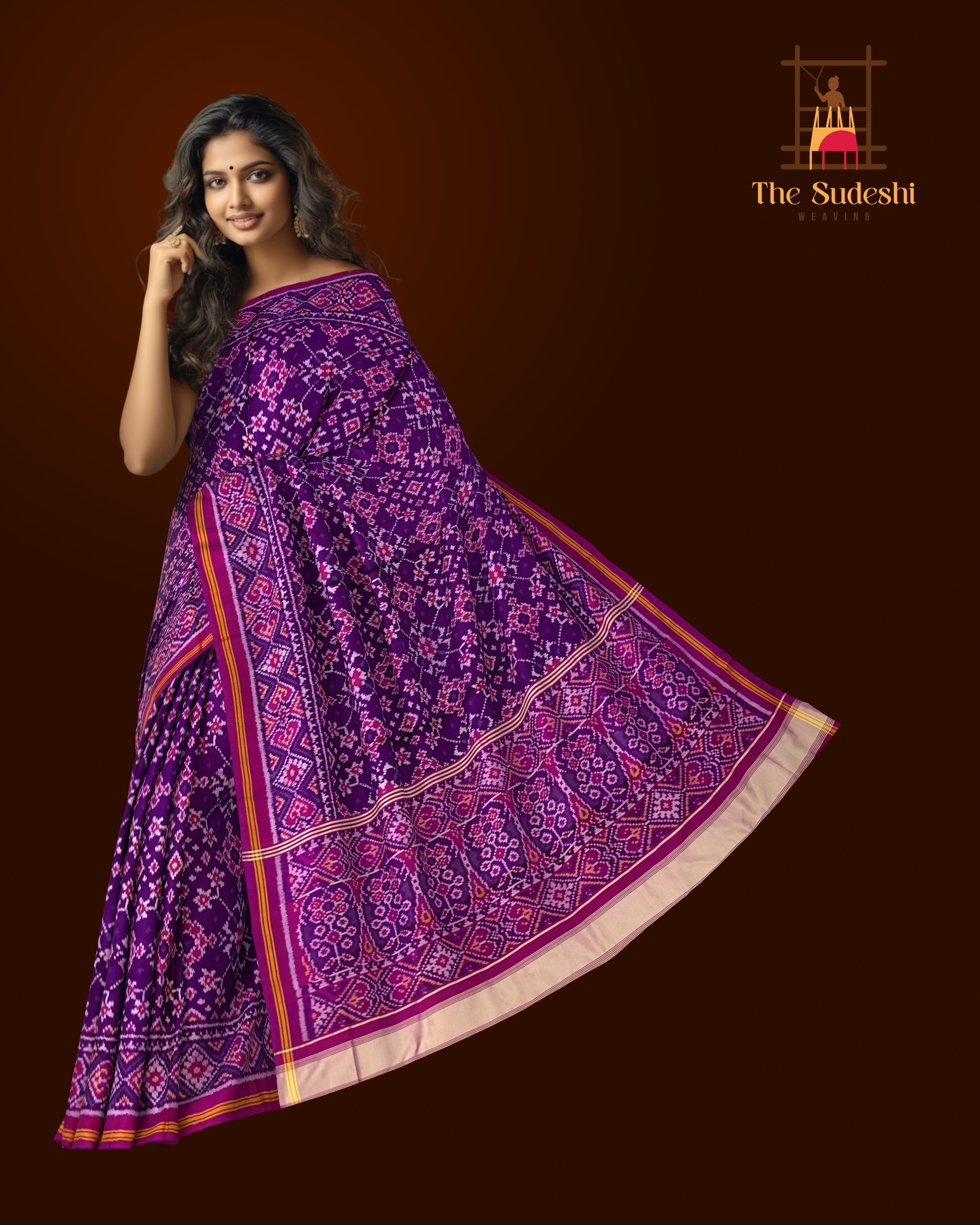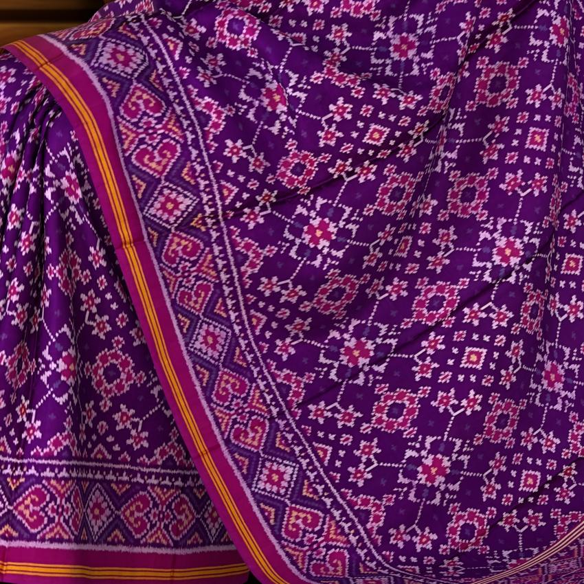 The Patola technique used in this saree is a traditional method of weaving, originating from the state of Gujarat. The technique involves weaving silk threads to create intricate designs and patterns.