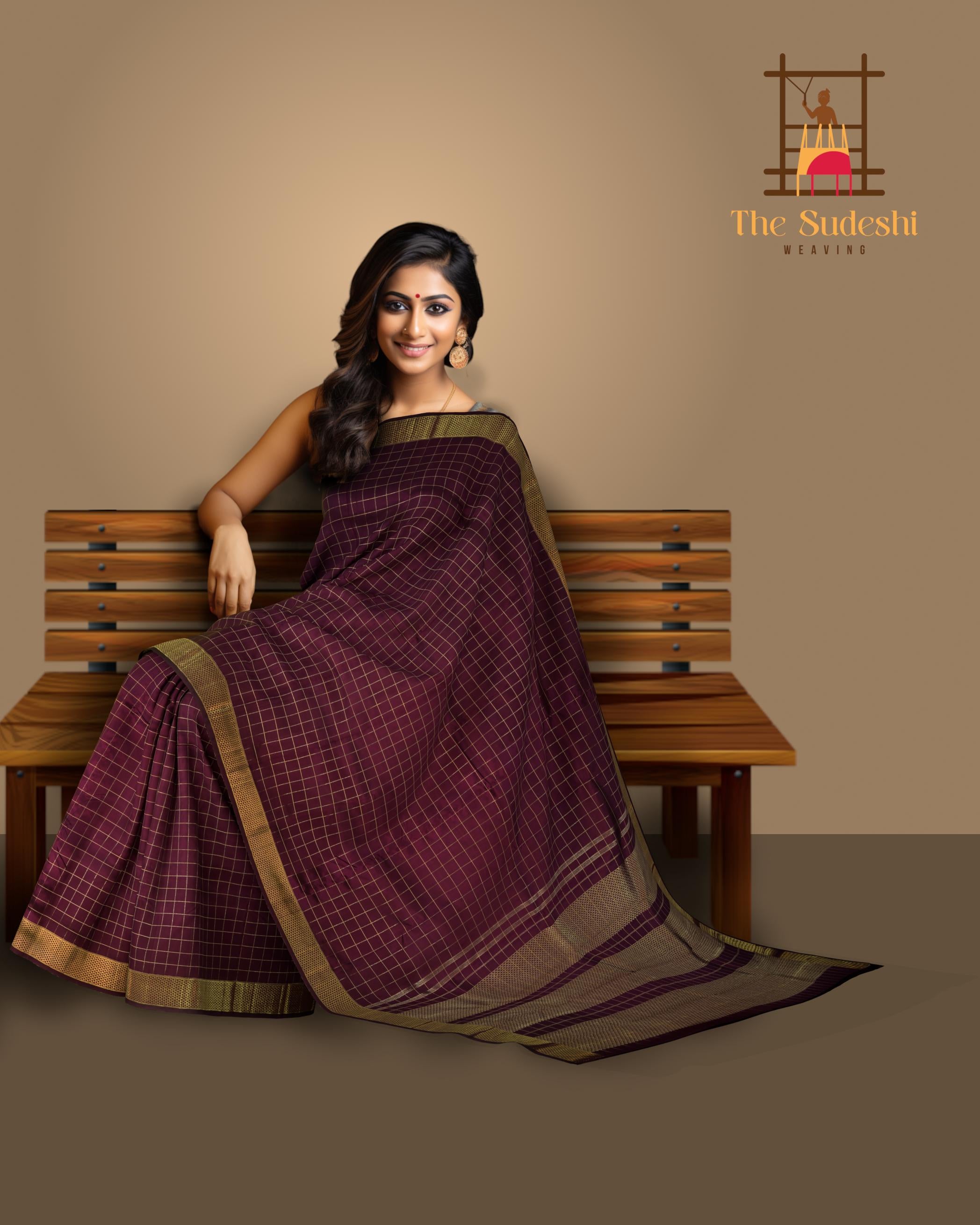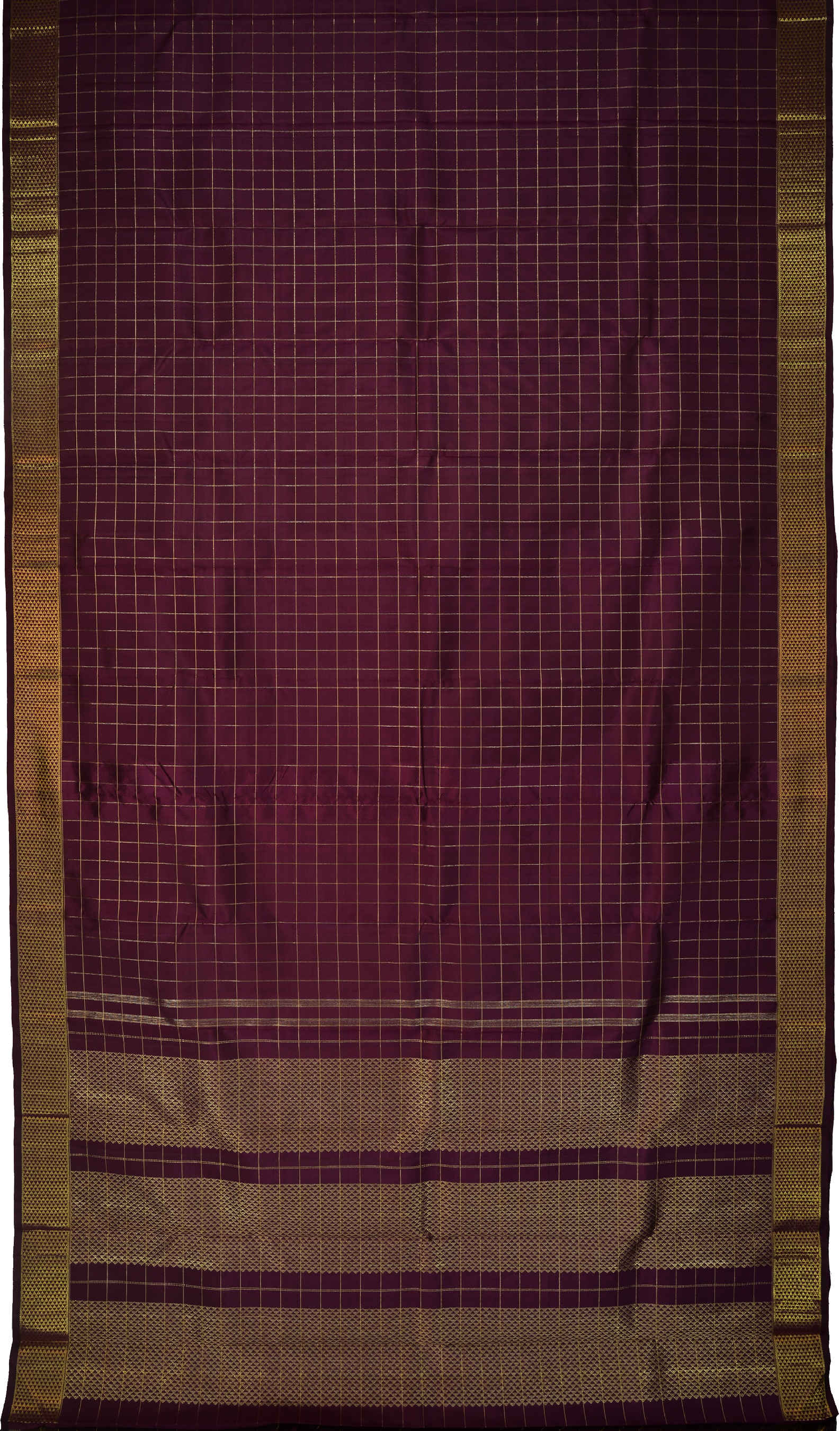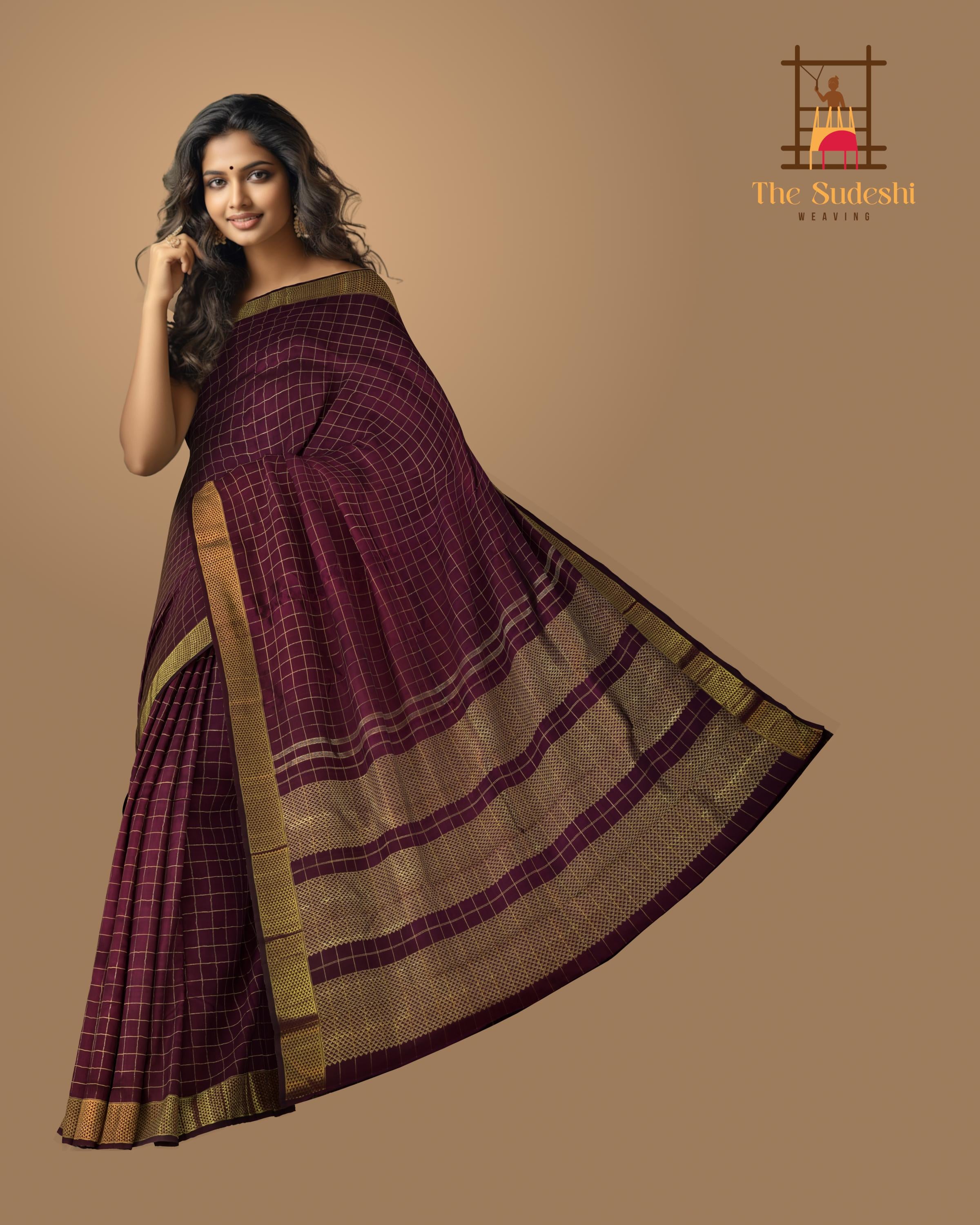 Its body, adorned with checks, narrates stories of intricate craftsmanship passed down through generations. The wine self-border, a canvas of artistry, showcases the mayil kann design - a symbol of grace and beauty. The pallu, in matching wine, resonates with the same elegance, exuding sophistication.