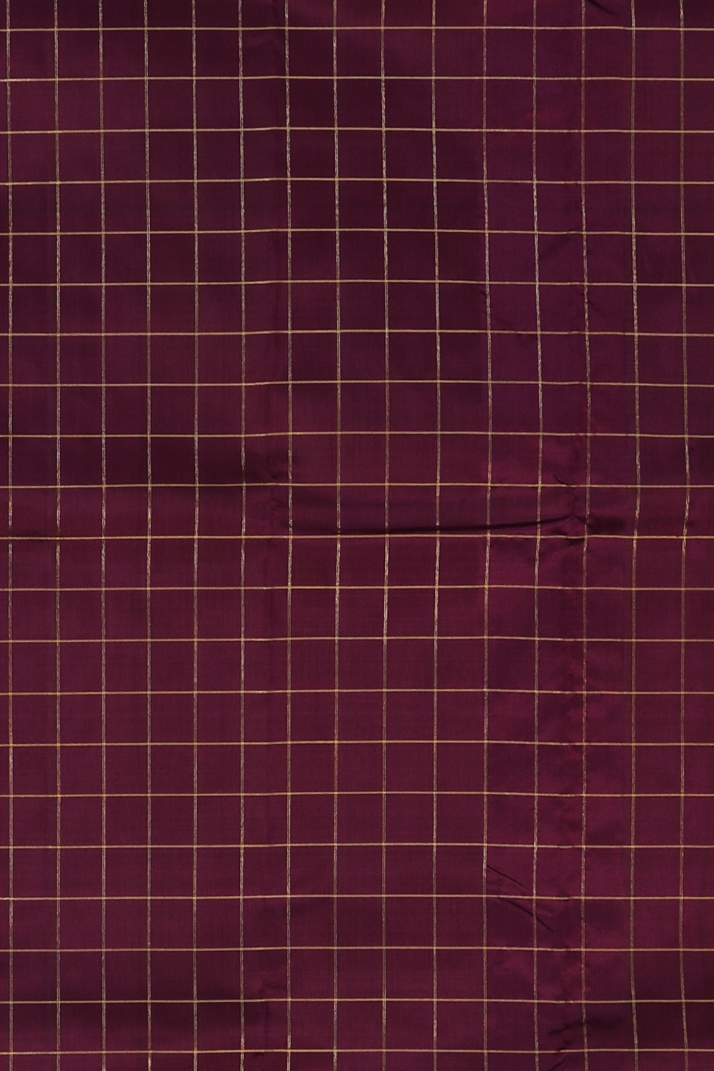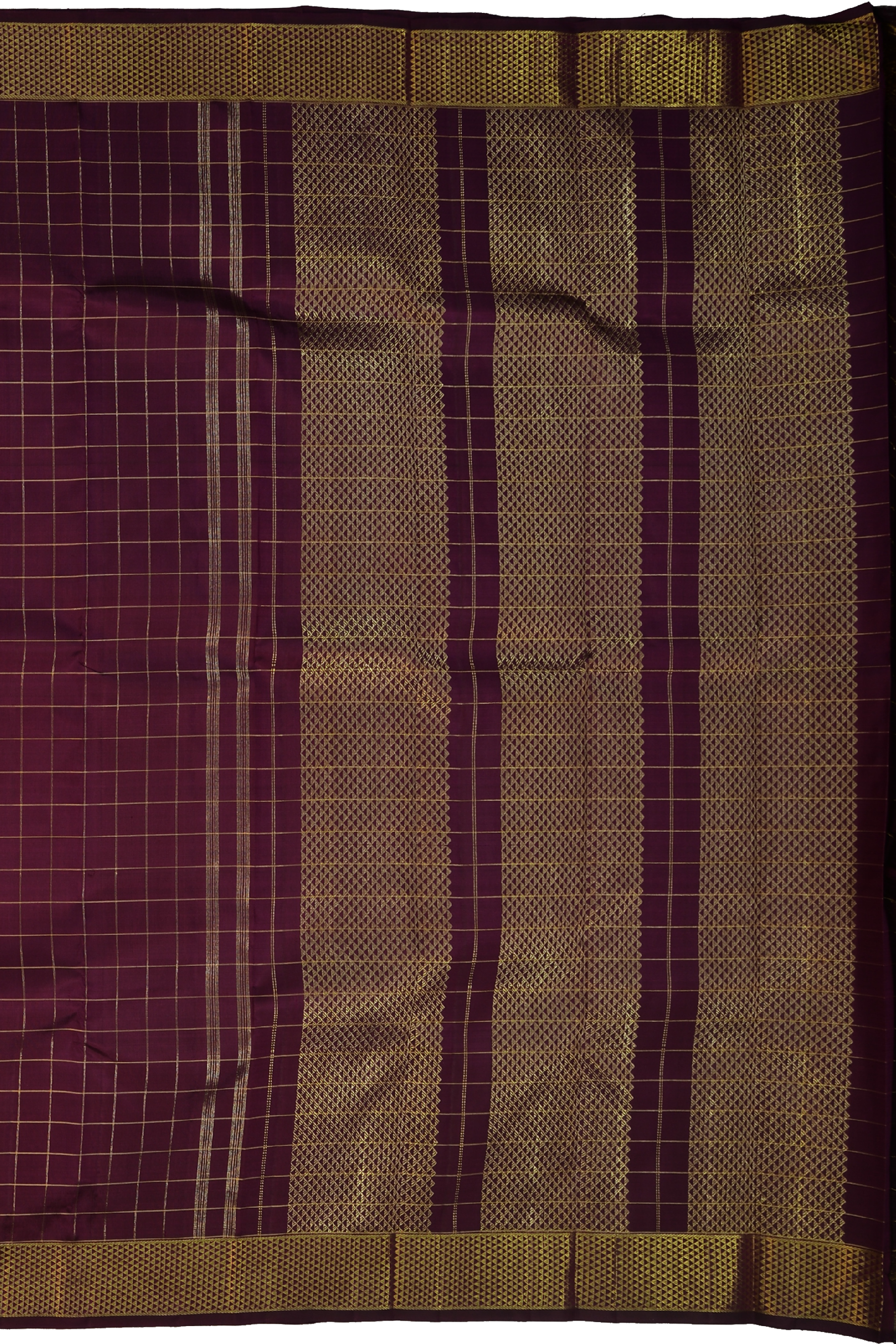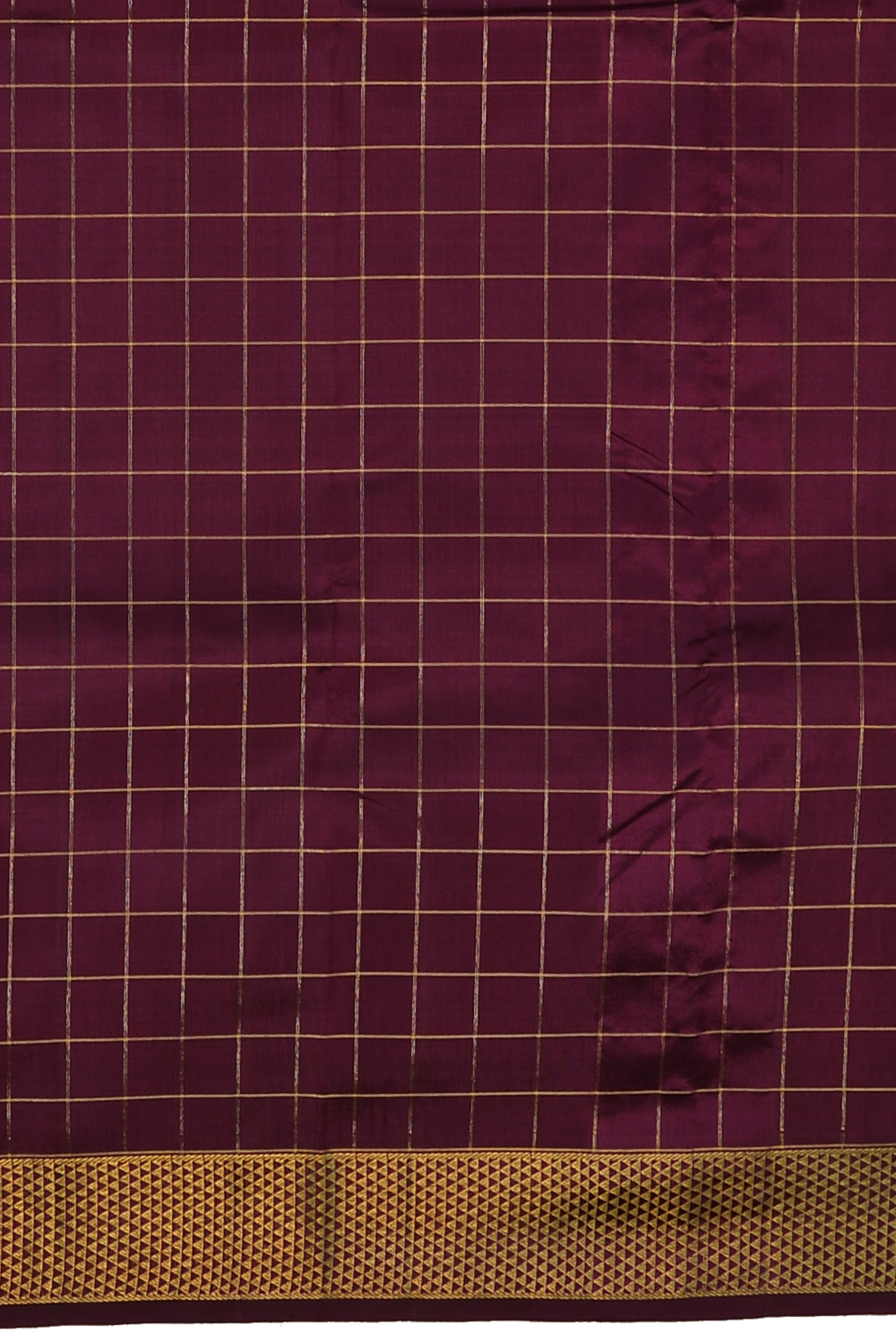 Its body, adorned with checks, narrates stories of intricate craftsmanship passed down through generations. The wine self-border, a canvas of artistry, showcases the mayil kann design - a symbol of grace and beauty. The pallu, in matching wine, resonates with the same elegance, exuding sophistication.