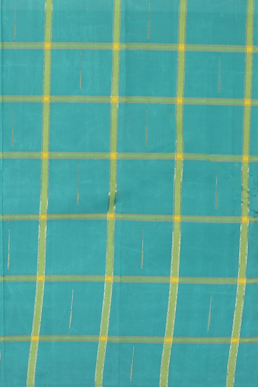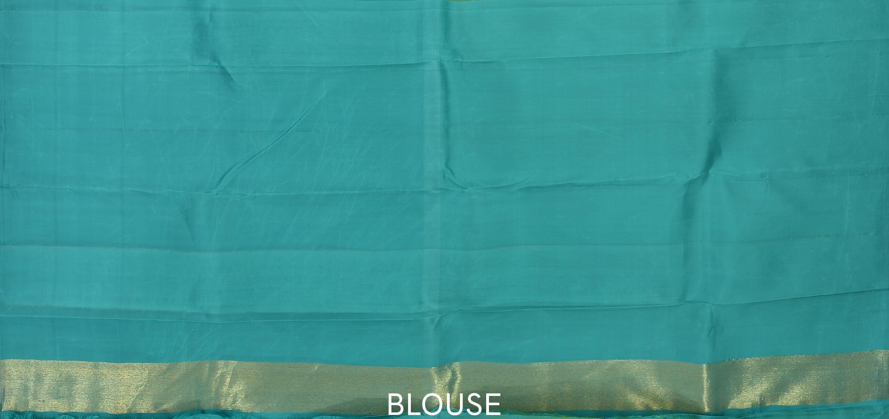 Celebrate the joy of color with this unique half-and-half Kancheevaram silk saree, where the sunny vibrance of yellow meets the serene calm of turquoise blue. The saree features mango motifs on the yellow and checks on the turquoise blue side, a playful yet elegant representation of traditional design. The turquoise blue pallu, adorned with 8 kol seep reku design, is a masterpiece of weaving, showcasing the skill and artistry that Kancheevaram is known for.