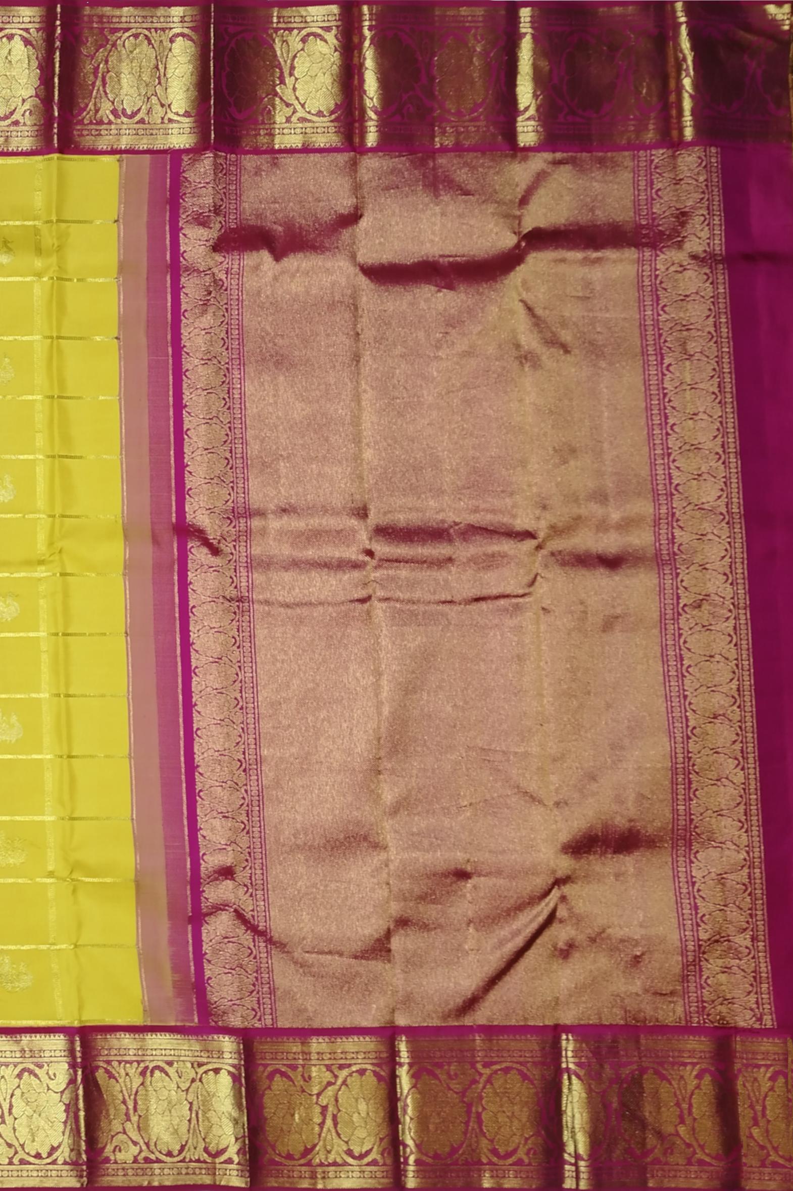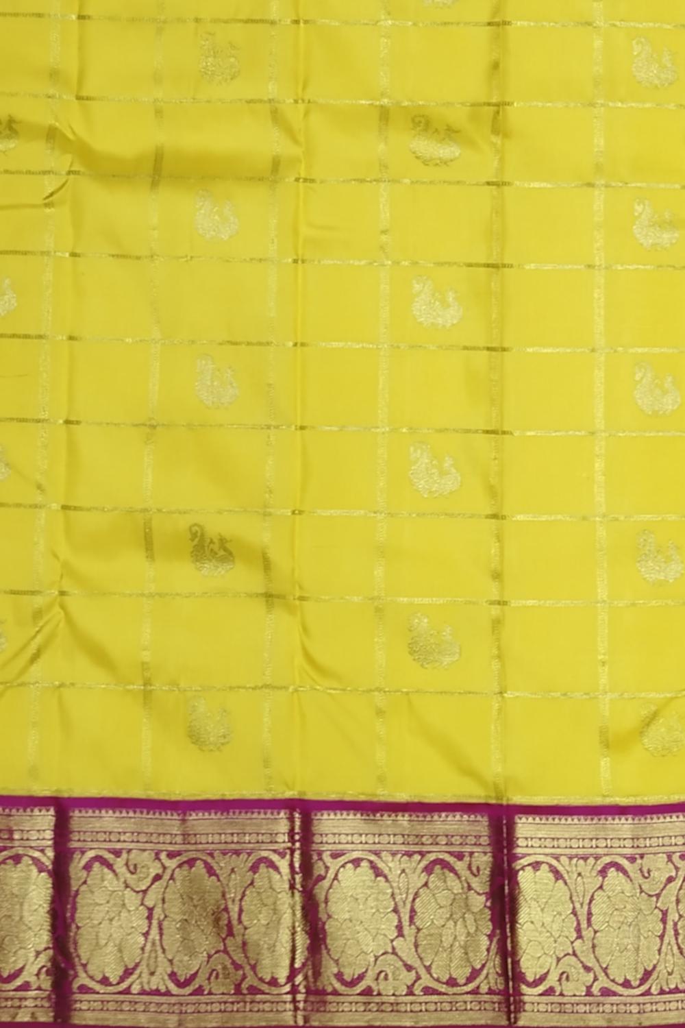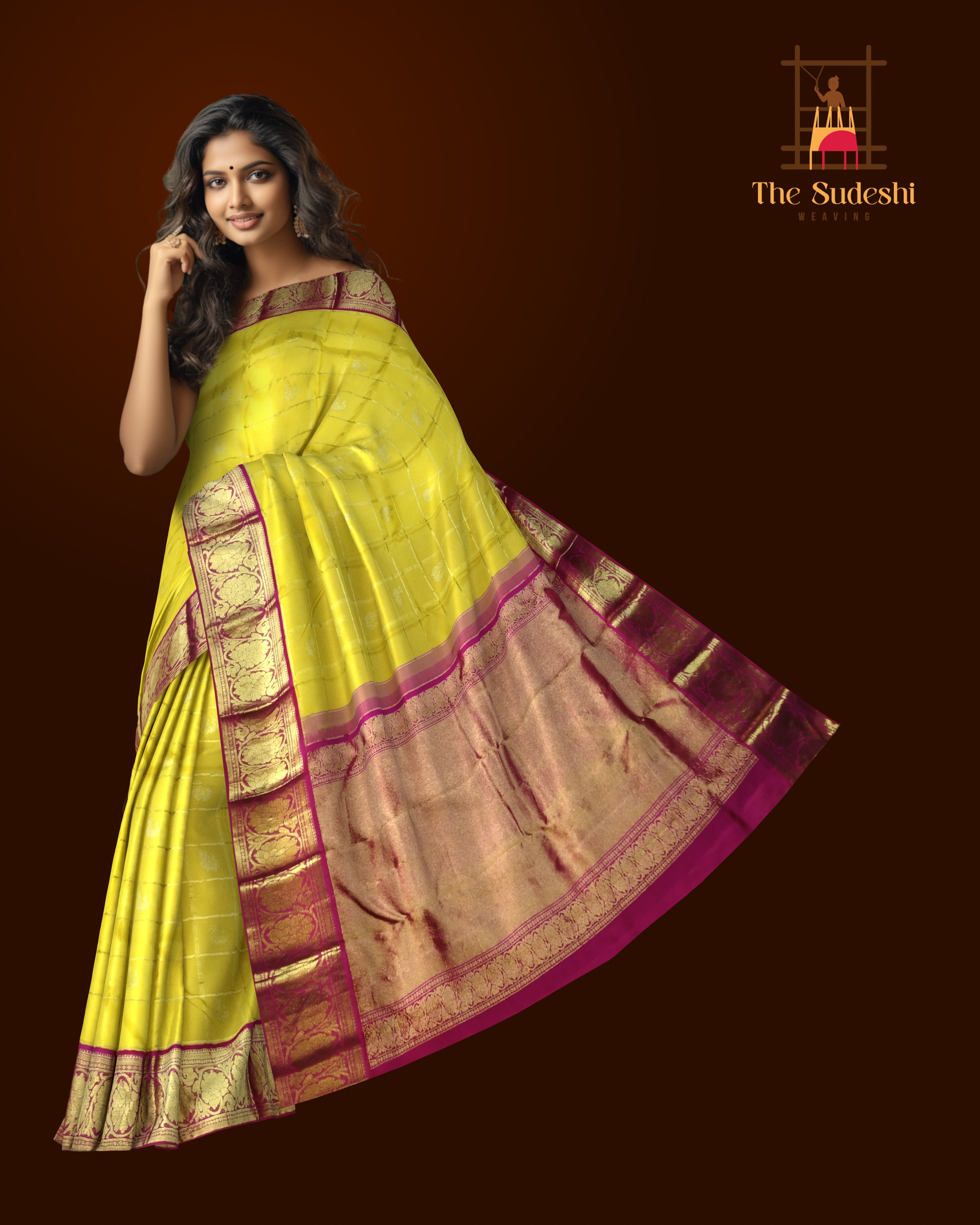 Bright yellow silk and a playful checkered body with peacock motifs create a saree that’s vibrant and culturally rich. Red borders bring festive warmth and contrast.