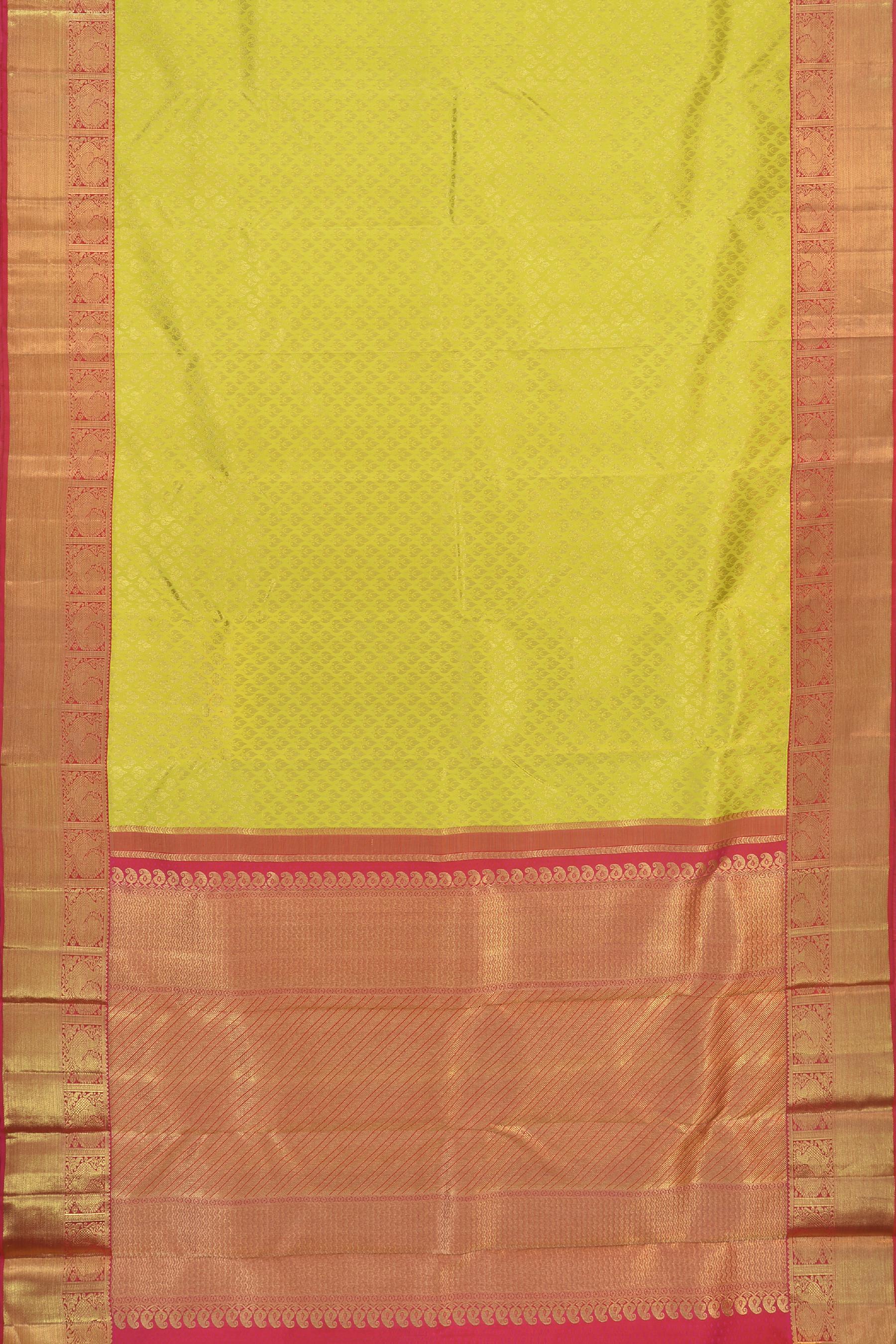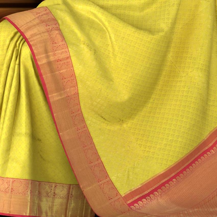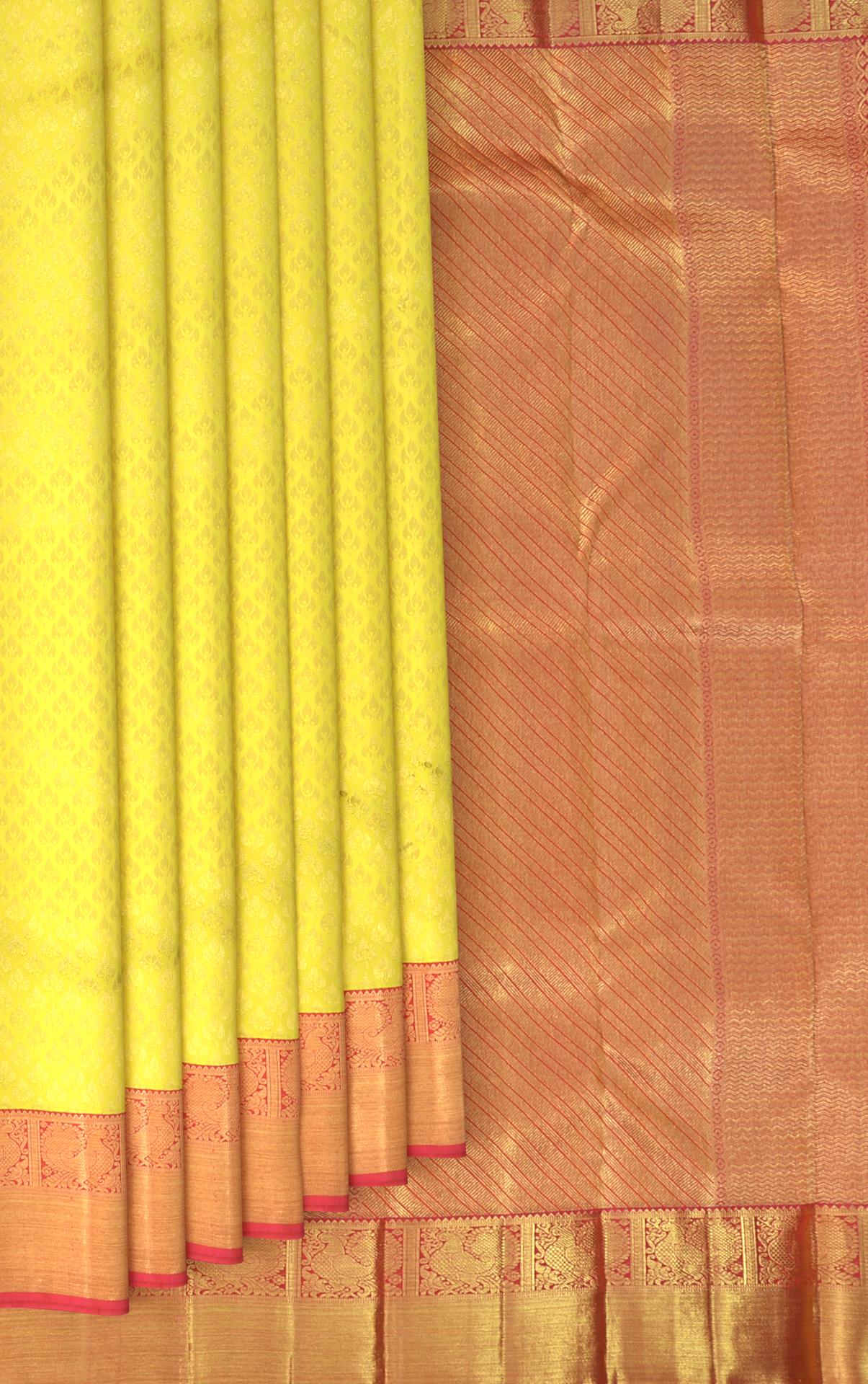 Illuminate any room with our Yellow Kancheevaram silk saree. Woven using a Jacquard technique, this saree features a delicate leaf motif that pays homage to the natural world. The contrasting Red border with the Benaraspet featuring Annam adds a striking touch to the saree's sunny demeanor.