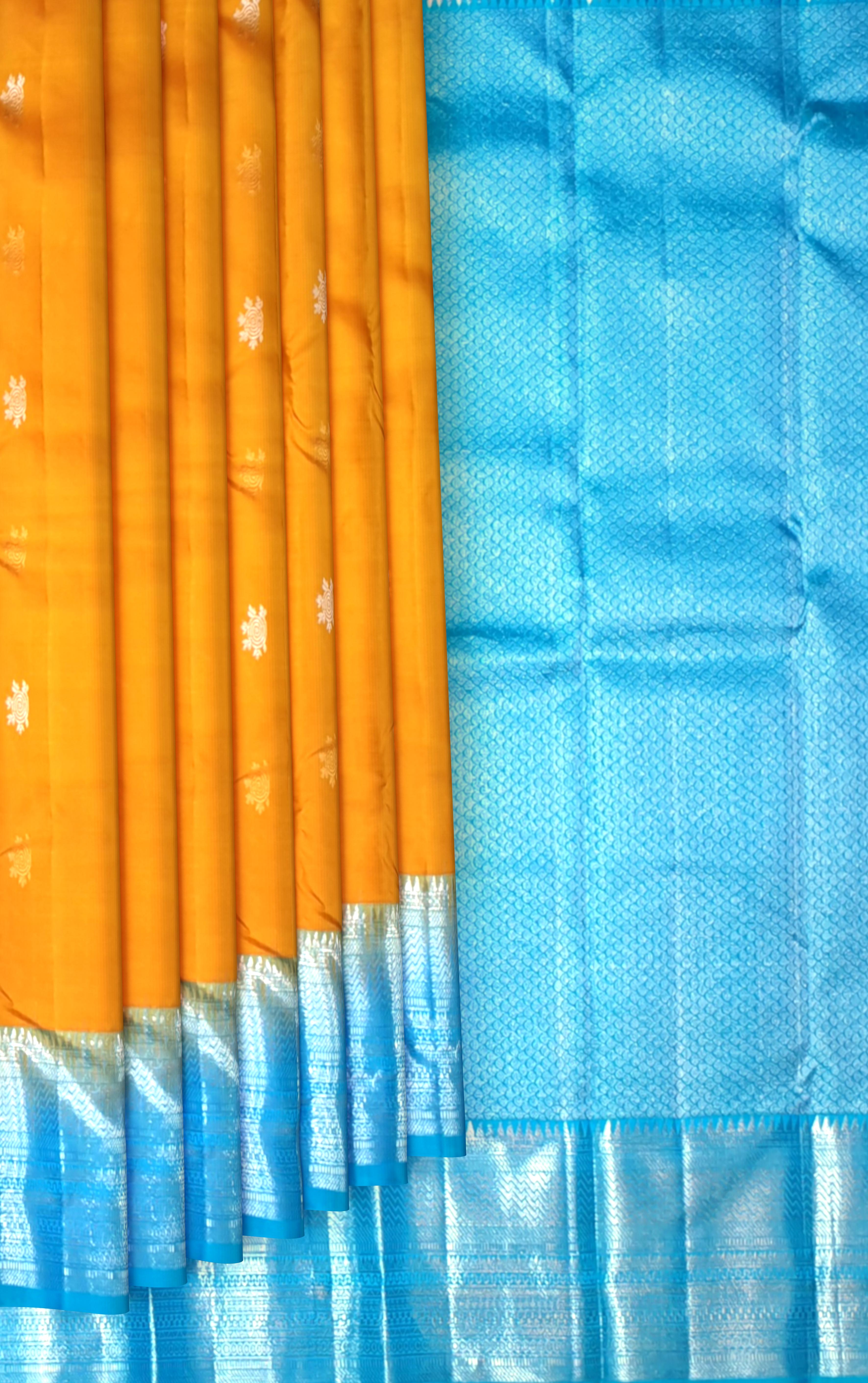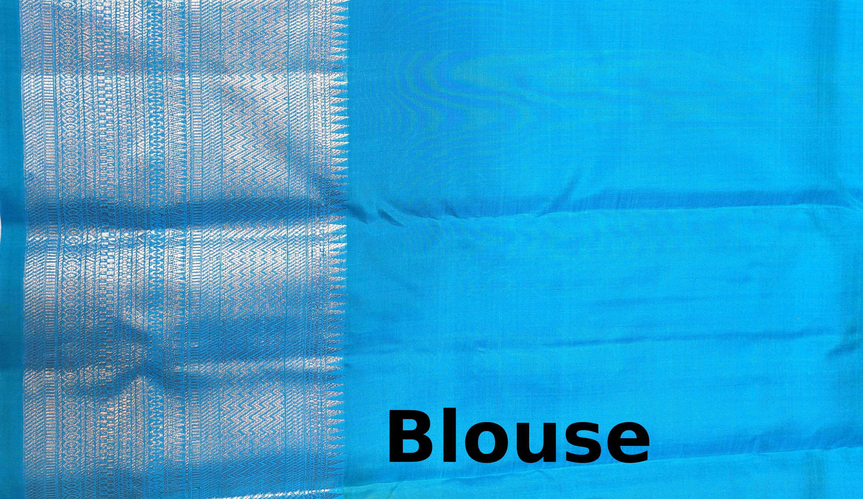Bright and beautiful, this yellow Kanchipuram silk saree is a joyful celebration of tradition, featuring delicate gold and silver zari motifs scattered across the body. The light blue border and pallu offer a refreshing contrast, enhancing the vibrancy of the yellow base while adding a graceful coolness to the overall palette. With its light blue blouse, this saree is a perfect fusion of radiant warmth and subtle elegance.