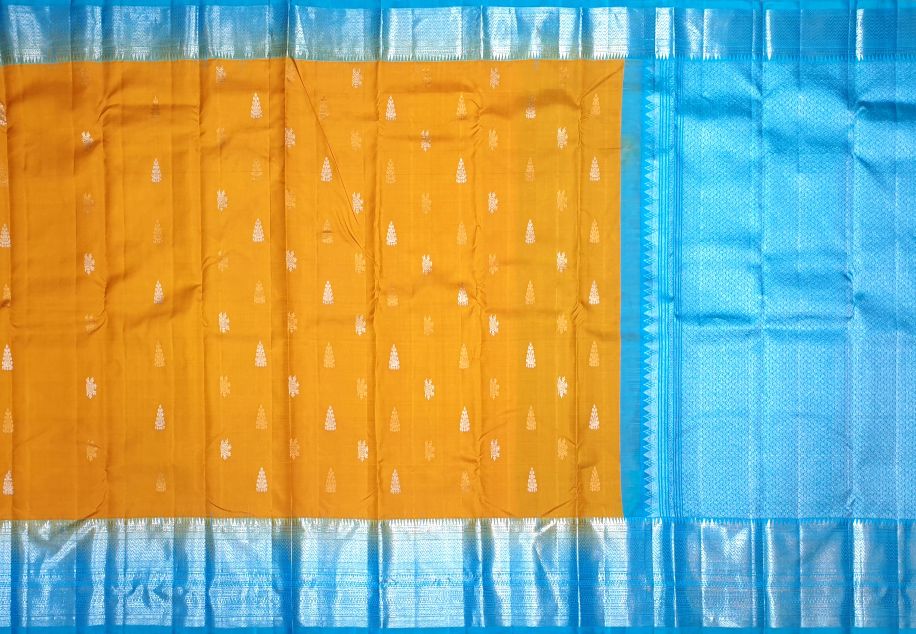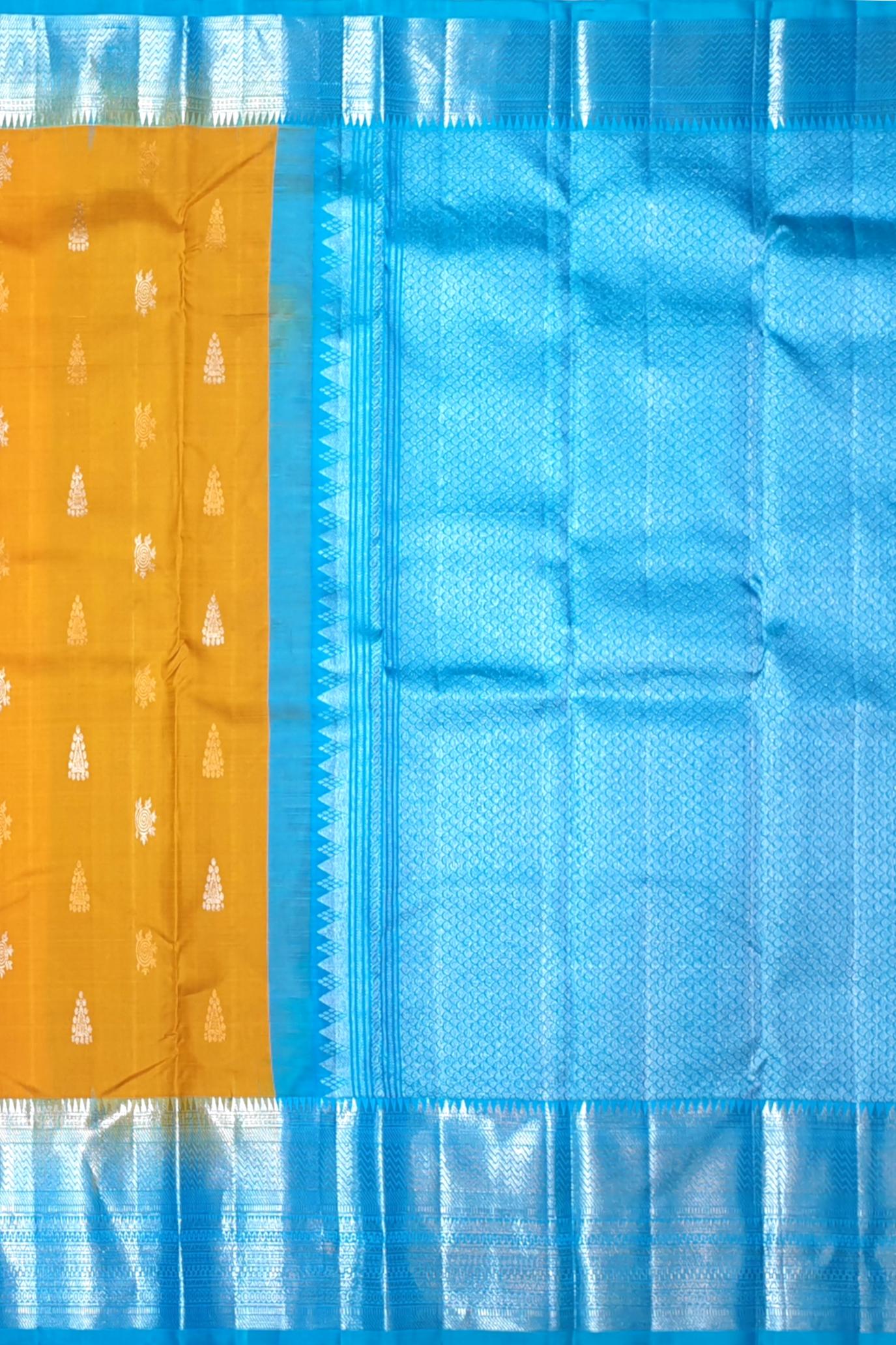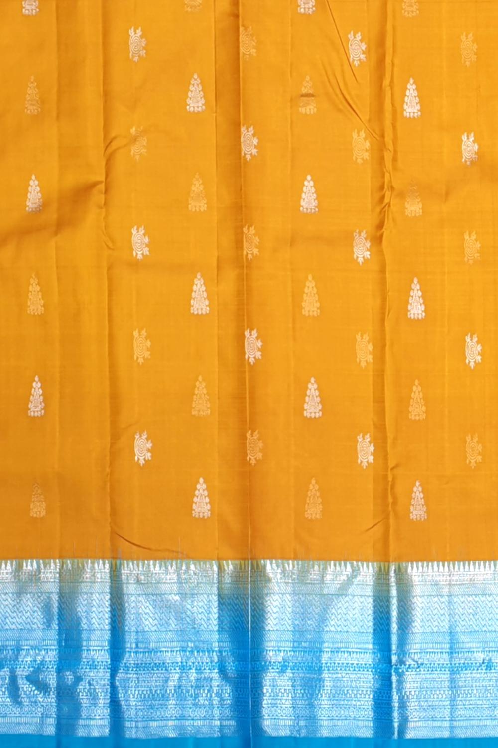 The interplay of gold and silver zari work on a single saree is a mark of skilled craftsmanship—a tribute to the dual energies of prosperity and serenity. The motifs, likely derived from nature and temple architecture, reflect the spiritual and artistic depth characteristic of Kanchipuram weaves. The cheerful yellow symbolizes purity, energy, and celebration, making this saree a standout in any traditional wardrobe.