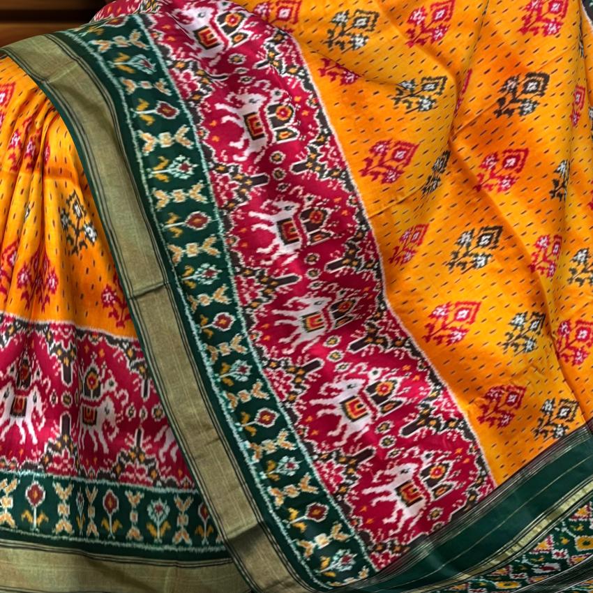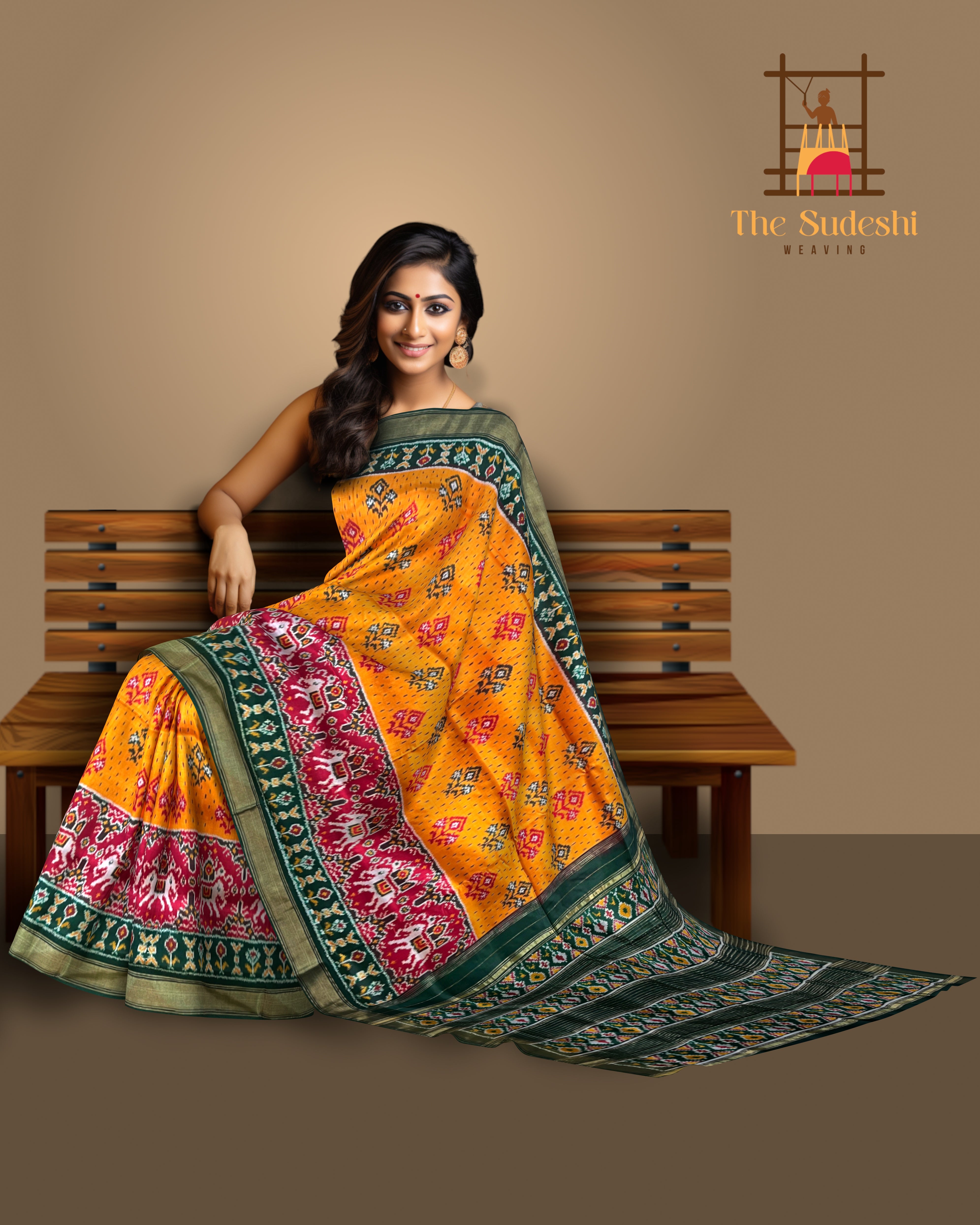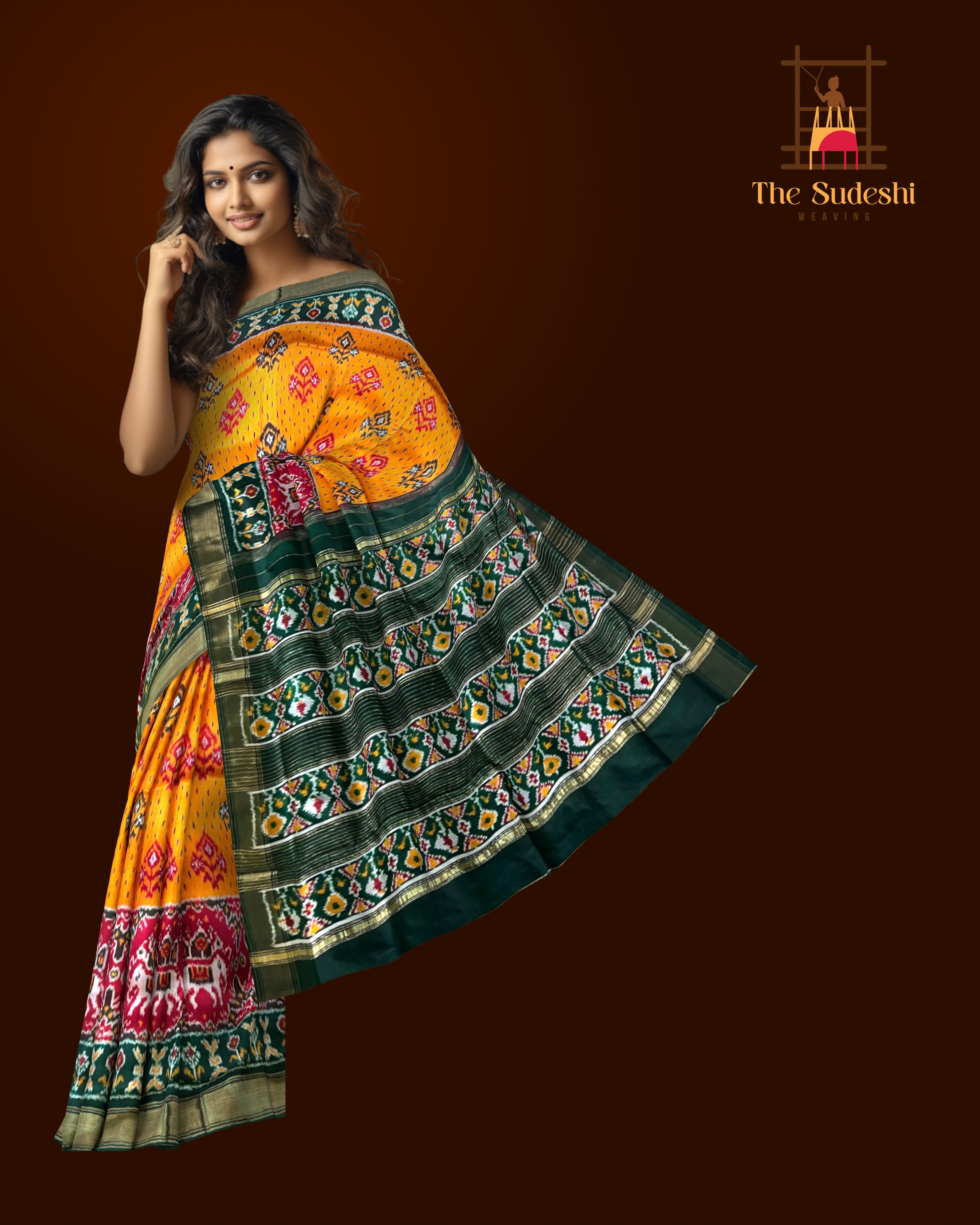 Bright and cheerful, the Yellow Pochampally Ikat Saree paired with a vibrant green border and pallu is a celebration of Indian tradition and festivity. The luminous yellow body radiates energy and positivity, while the green accents add a refreshing contrast, creating a saree that’s perfect for joyous occasions. Handwoven in Pochampally, Telangana, this saree features the intricate double ikat weaving technique, where each thread is pre-dyed and meticulously aligned. Yellow symbolizes happiness and prosperity, while green represents growth and new beginnings — together reflecting auspiciousness and harmony. This saree is an ideal choice for haldi ceremonies, festive mornings, and family celebrations. Pair it with a green or gold blouse, and accessorize with traditional gold jewelry or floral adornments for an uplifting and graceful look. Note: The appearance of the product’s colors may vary due to lighting conditions or your device’s screen calibration. For further assistance or additional images/videos, feel free to contact us at +91 97897 60367 / +1 (945) 308-5962 or email at wecare@thesudeshiweaving.com.