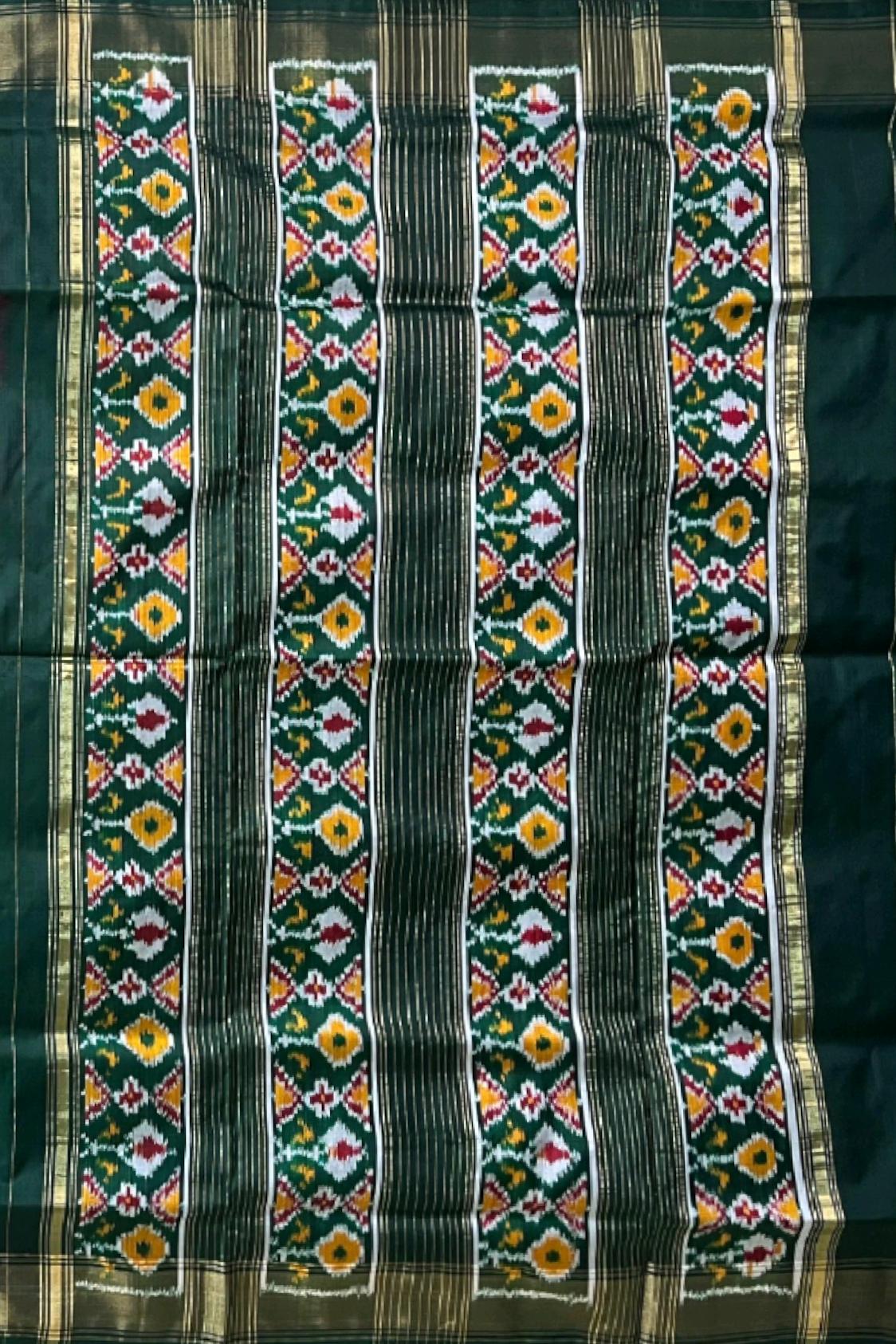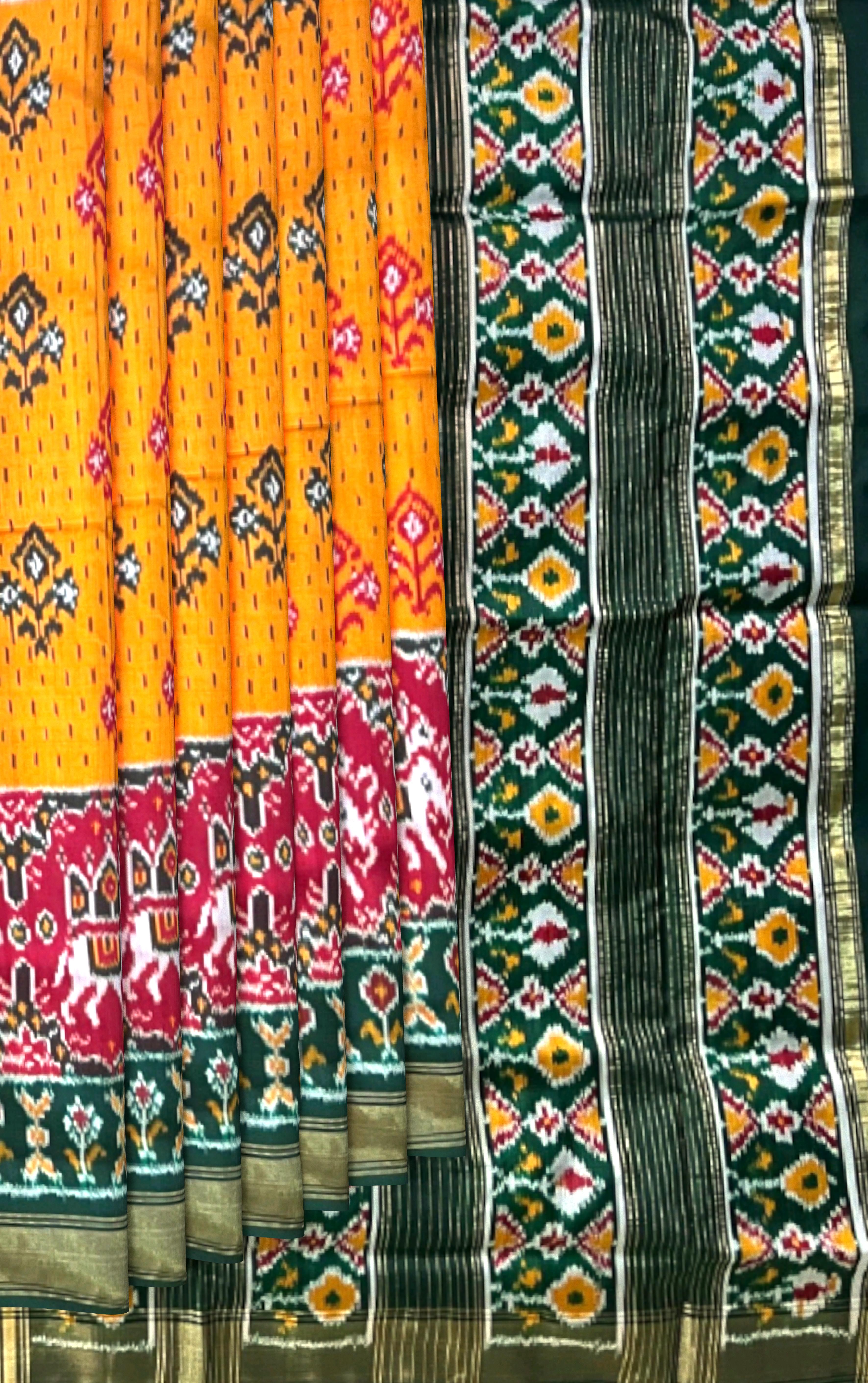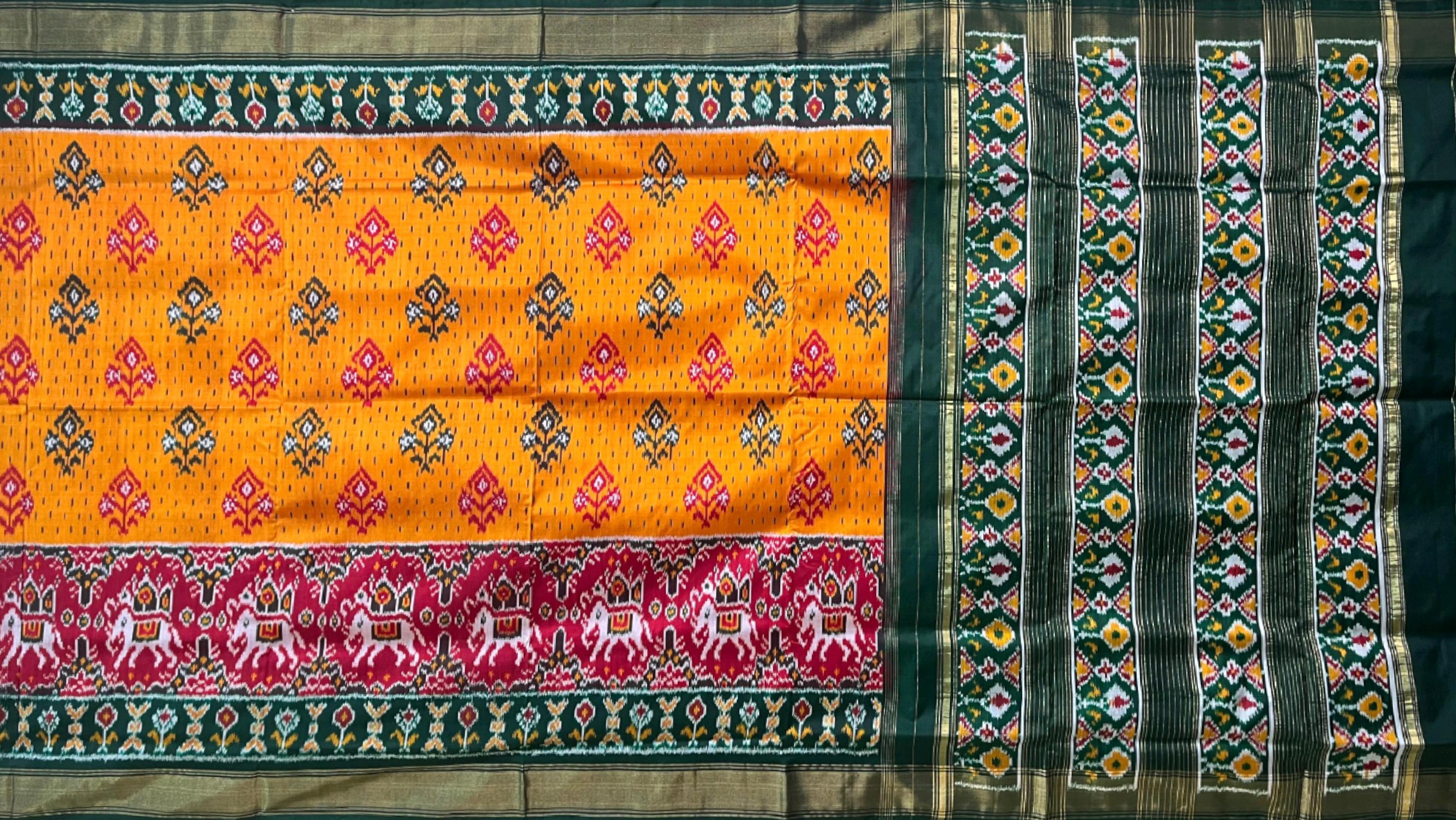 Bright and cheerful, the Yellow Pochampally Ikat Saree paired with a vibrant green border and pallu is a celebration of Indian tradition and festivity. The luminous yellow body radiates energy and positivity, while the green accents add a refreshing contrast, creating a saree that’s perfect for joyous occasions. Handwoven in Pochampally, Telangana, this saree features the intricate double ikat weaving technique, where each thread is pre-dyed and meticulously aligned. Yellow symbolizes happiness and prosperity, while green represents growth and new beginnings — together reflecting auspiciousness and harmony. This saree is an ideal choice for haldi ceremonies, festive mornings, and family celebrations. Pair it with a green or gold blouse, and accessorize with traditional gold jewelry or floral adornments for an uplifting and graceful look. Note: The appearance of the product’s colors may vary due to lighting conditions or your device’s screen calibration. For further assistance or additional images/videos, feel free to contact us at +91 97897 60367 / +1 (945) 308-5962 or email at wecare@thesudeshiweaving.com.