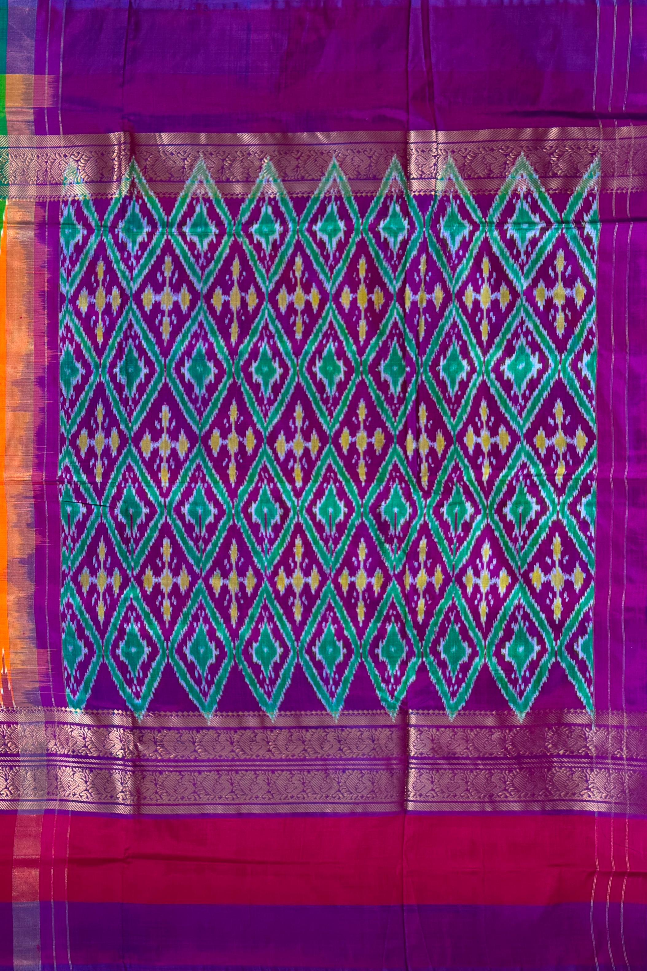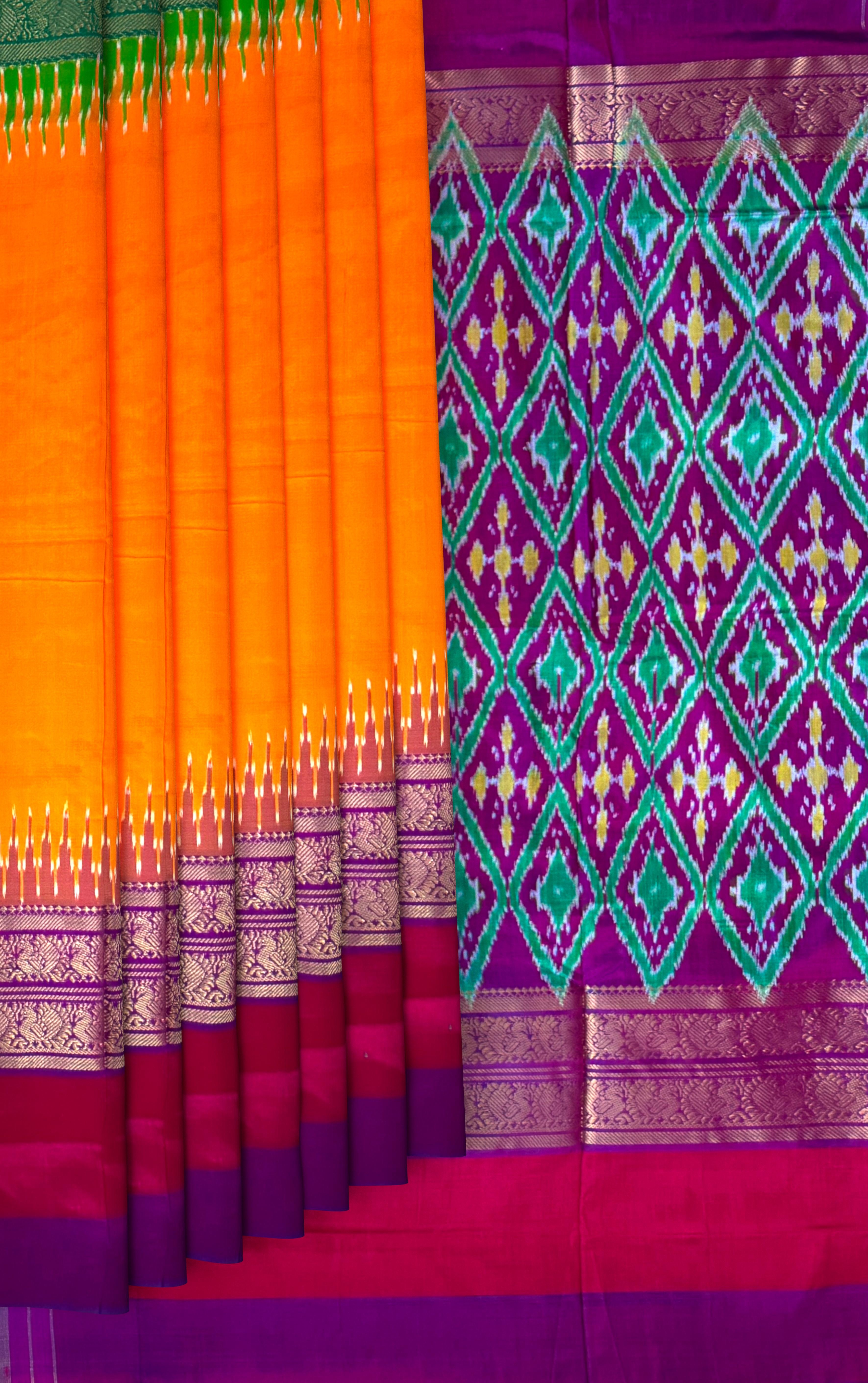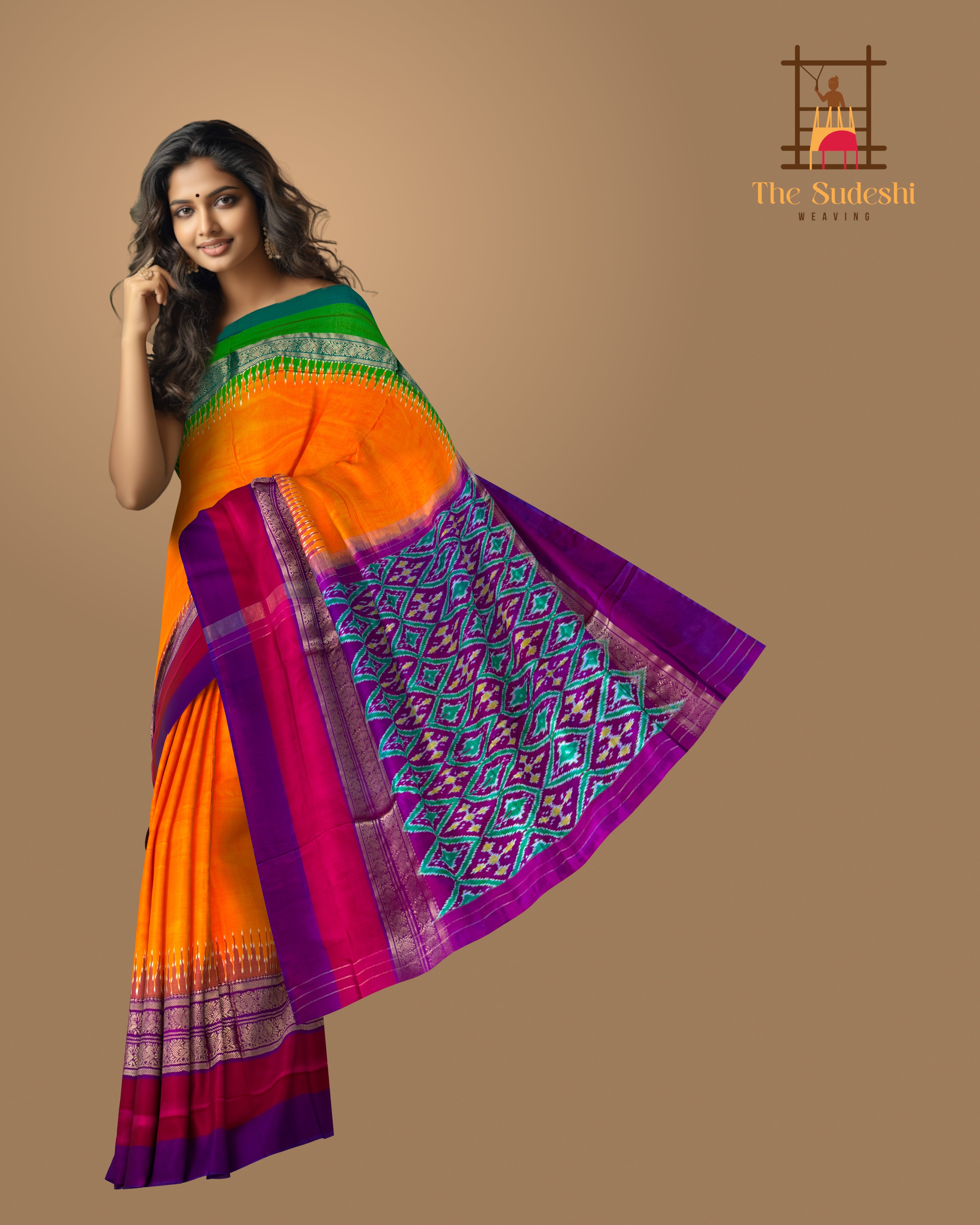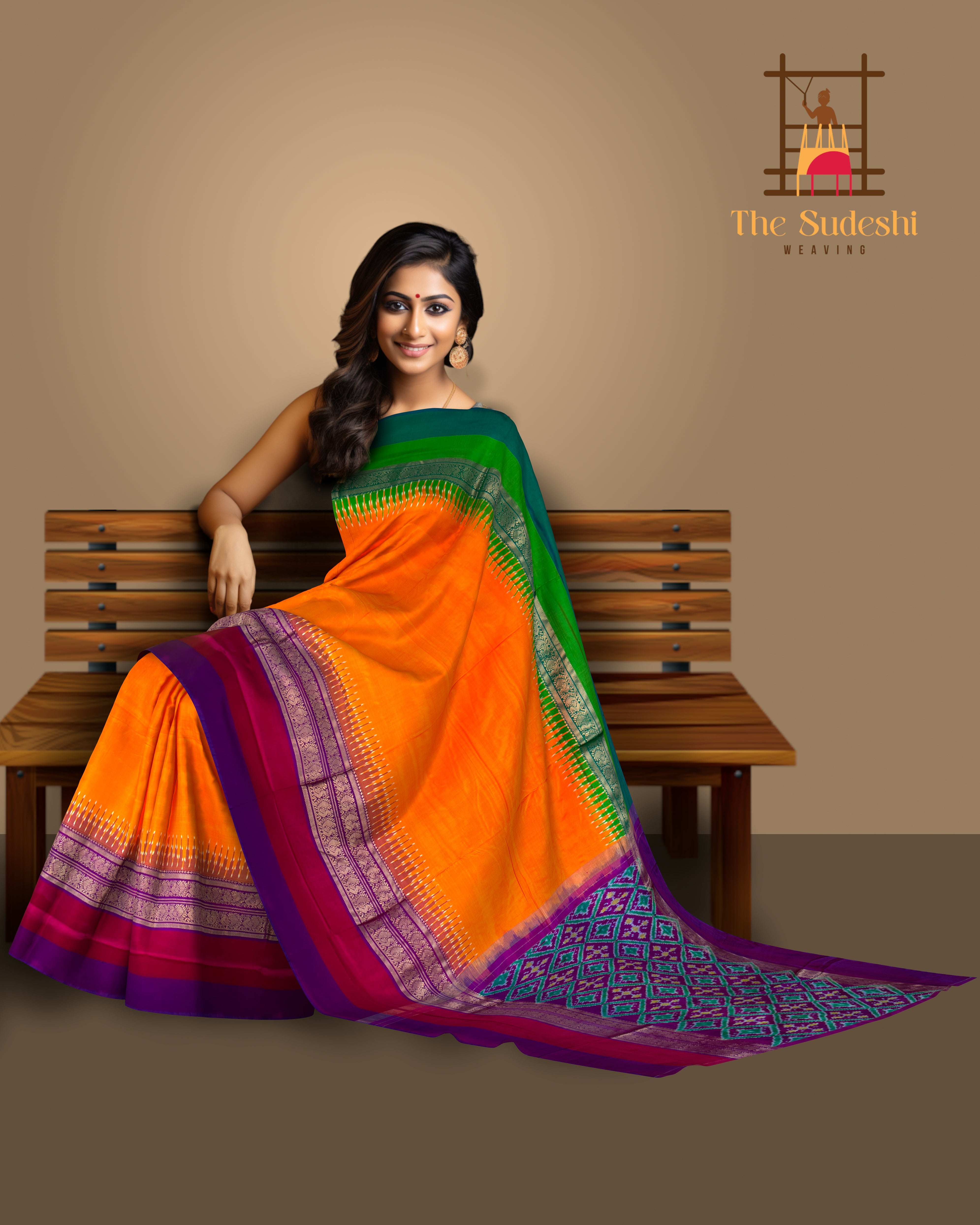 Bright and cheerful, this Yellow Pochampally Ikat Saree captures the essence of joy and festivity. The vibrant yellow body is adorned with a striking multi-color border, while the Ganga Jamuna Kanchi pallu lends a touch of grandeur. The overall ensemble is a lively yet elegant choice for daytime events and celebrations. Pochampally Ikat, from the heart of Telangana, is renowned for its complex weaving process where each yarn is dyed to precision before being woven into fabric. The patterns, often geometric or symbolic, reflect cultural beliefs around energy, renewal, and prosperity. Yellow, in particular, is a color of positivity and spirituality in Indian culture. Perfect for religious ceremonies, haldi functions, or festive family gatherings, this saree pairs best with contrast blouses in green, pink, or maroon. Accessorize with gold jewelry or floral adornments for a fresh, traditional look. Note: The appearance of the product’s colors may vary due to lighting conditions or your device’s screen calibration. For further assistance or additional images/videos, feel free to contact us at +91 97897 60367 / +1 (945) 308-5962 or email at wecare@thesudeshiweaving.com.