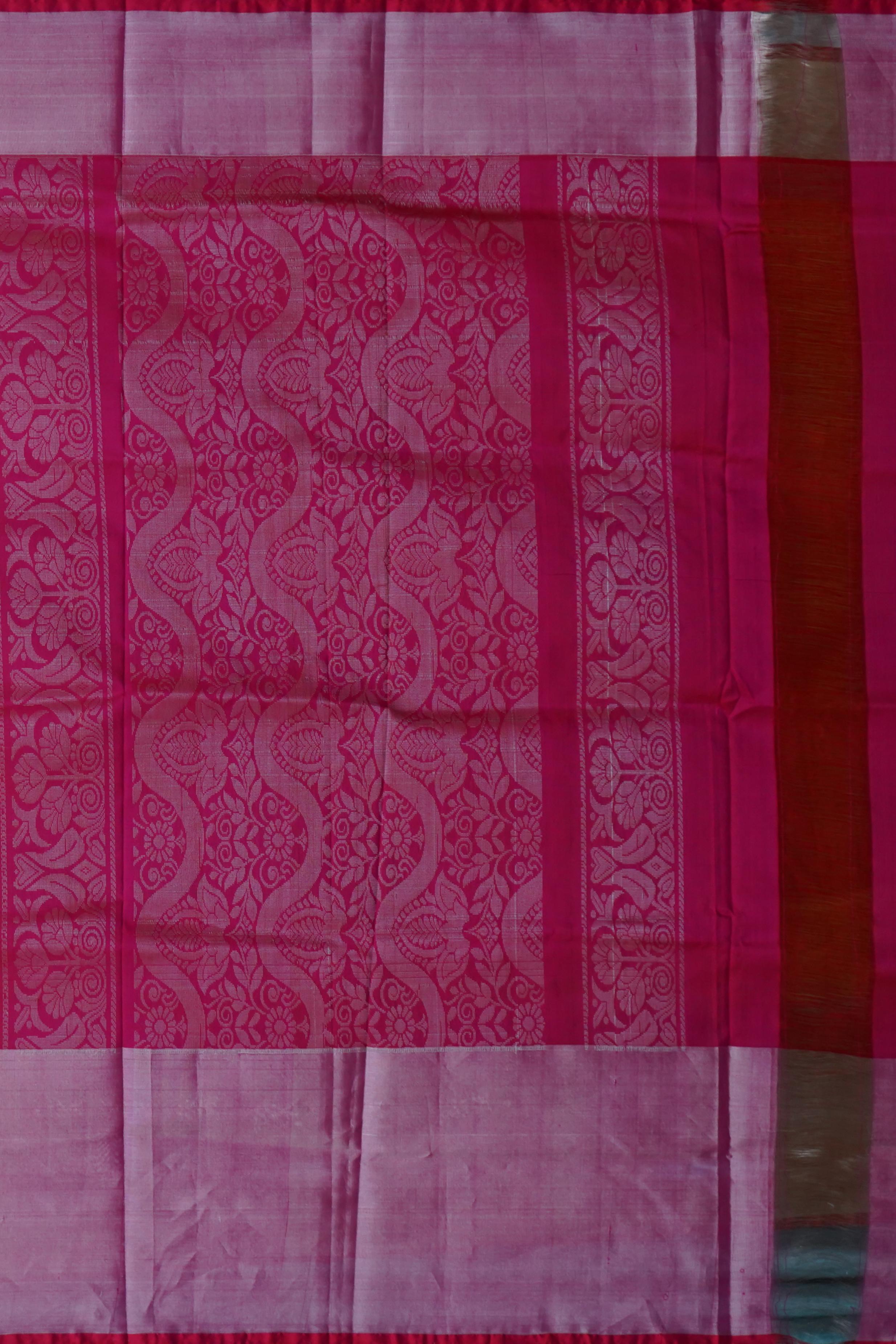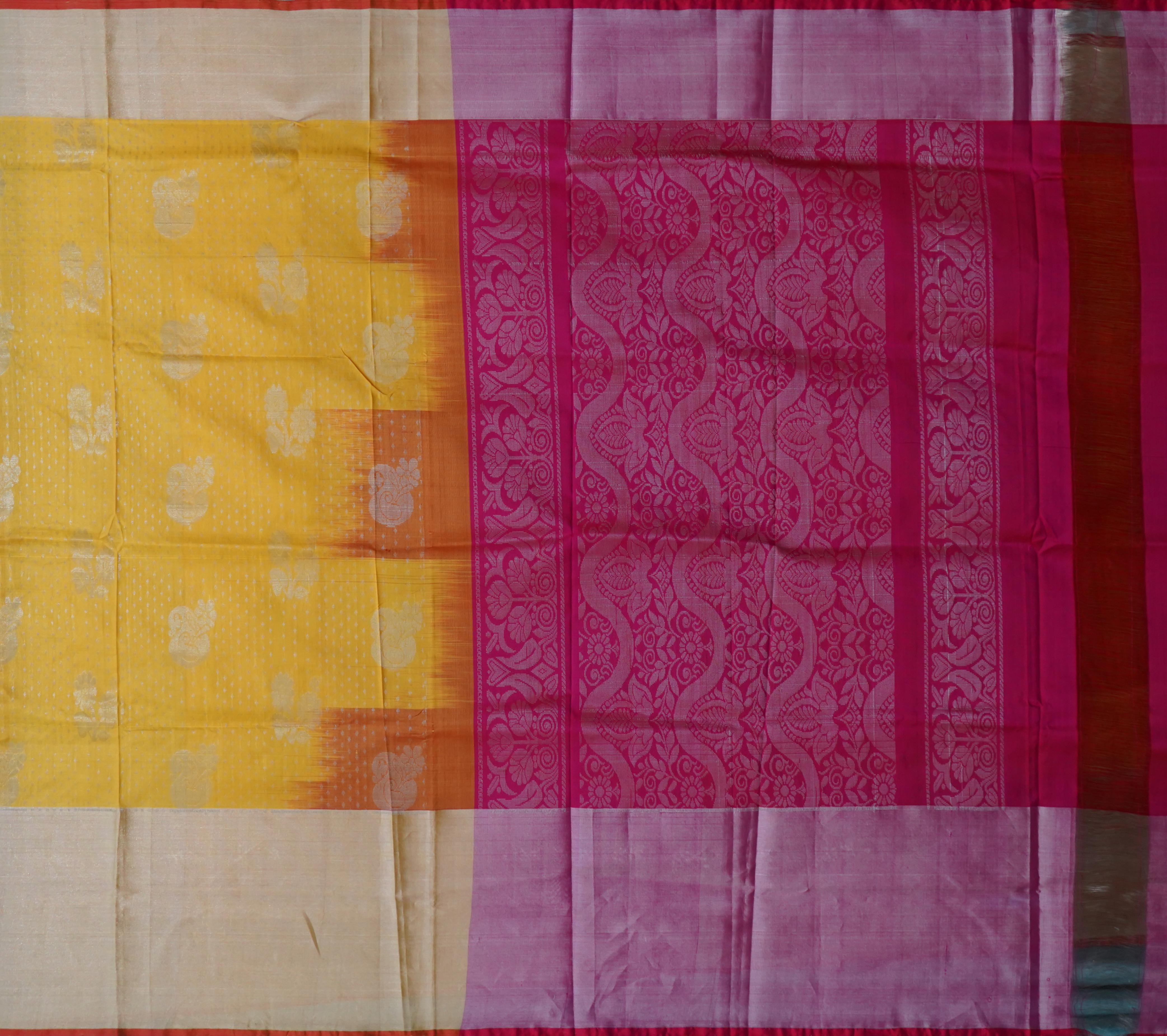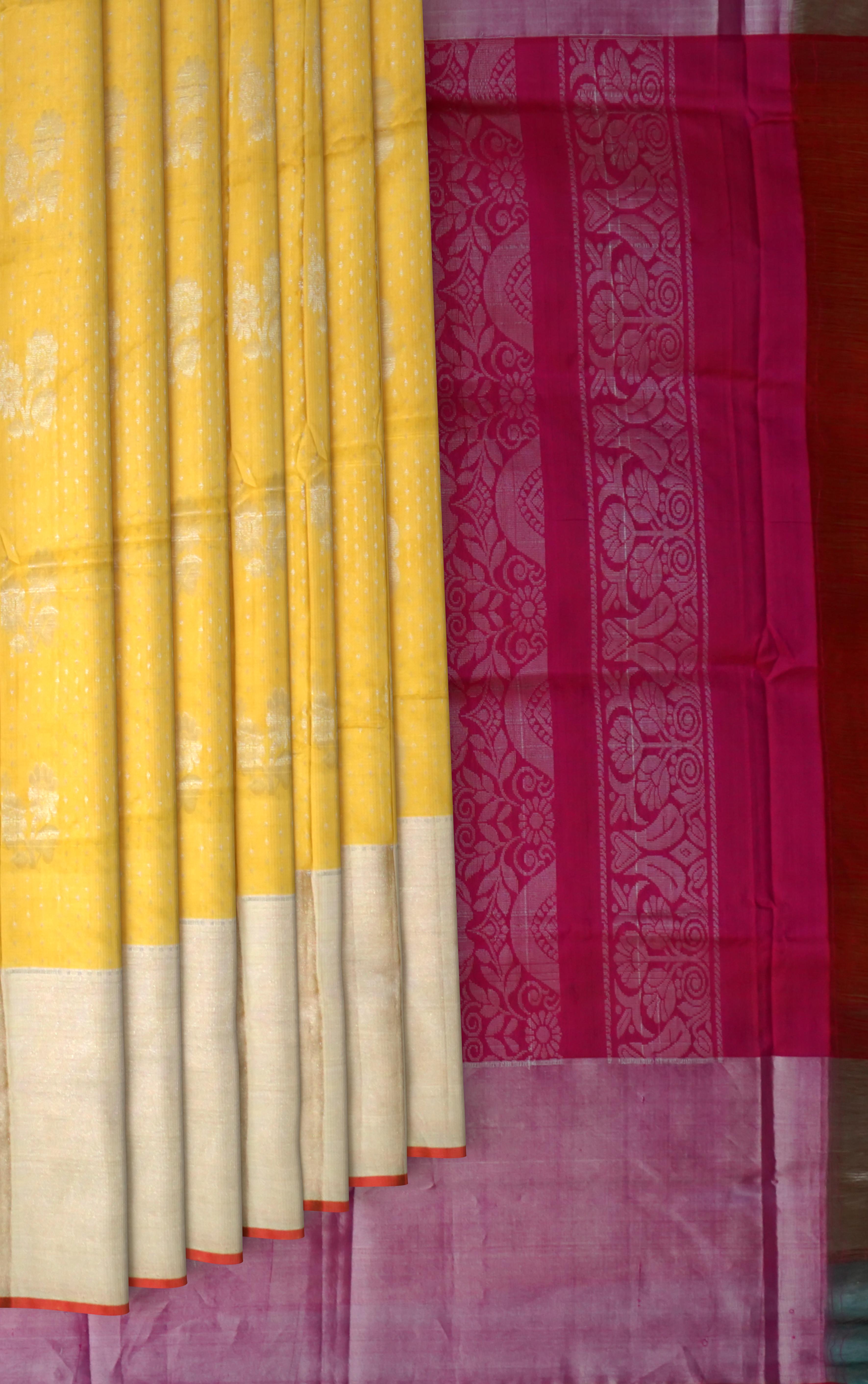 This vibrant Yellow Uppada Saree features silver buttas woven intricately across the fabric, bringing out the richness of the saree. The silver border adds a sleek and modern touch, while the vibrant yellow color brings warmth and joy to the design. The combination of these elements creates a radiant look that is perfect for any festive celebration.